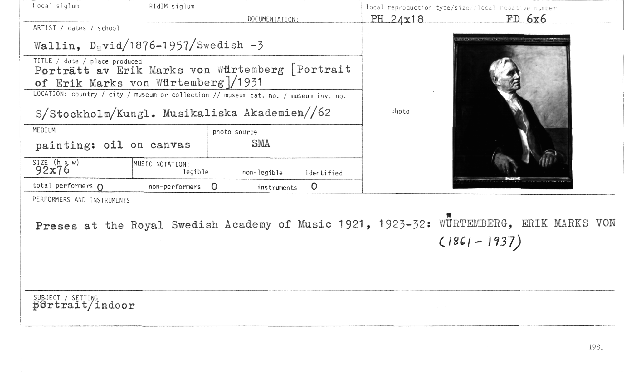 //// 1 ocal siglum RIdIM siglum //// ARTIST / dates / school //// lotal reproduction type/size lotal neatve number //// 211_24x18 FD 6x6 //// DOCUMENTATION: //// Wallin, Nvid/1876-1957/Swedish -3 //// TITLE / date / place produced //// Porträtt av Erik Marks von Wartemberg [Portrait //// of Erik Marks von Wfirtemberg]/1931 //// LOCATION: country / city / museum or collection // museum cat. no. / museum inv. no. //// S/Stockholm/Kungl. Musikaliska Akademien//62 //// MEDIUM //// painting: oil on canvas //// S5I17 g w) //// total performers 0 non-performers 0 instruments 0 //// MUSIC NOTATION: //// legible non-legible identified //// photo source //// SMA //// photo //// PERFORMERS AND INSTRUMENTS //// ^ //// Preses at the Royal Swedish Academy of Music 1921, 1923-32: WURTEMBERG, ERIK MARKS VON //// ClgCI - 1937) //// SU JECT / SETTIUG //// rtrait/indoor //// 1981 ////