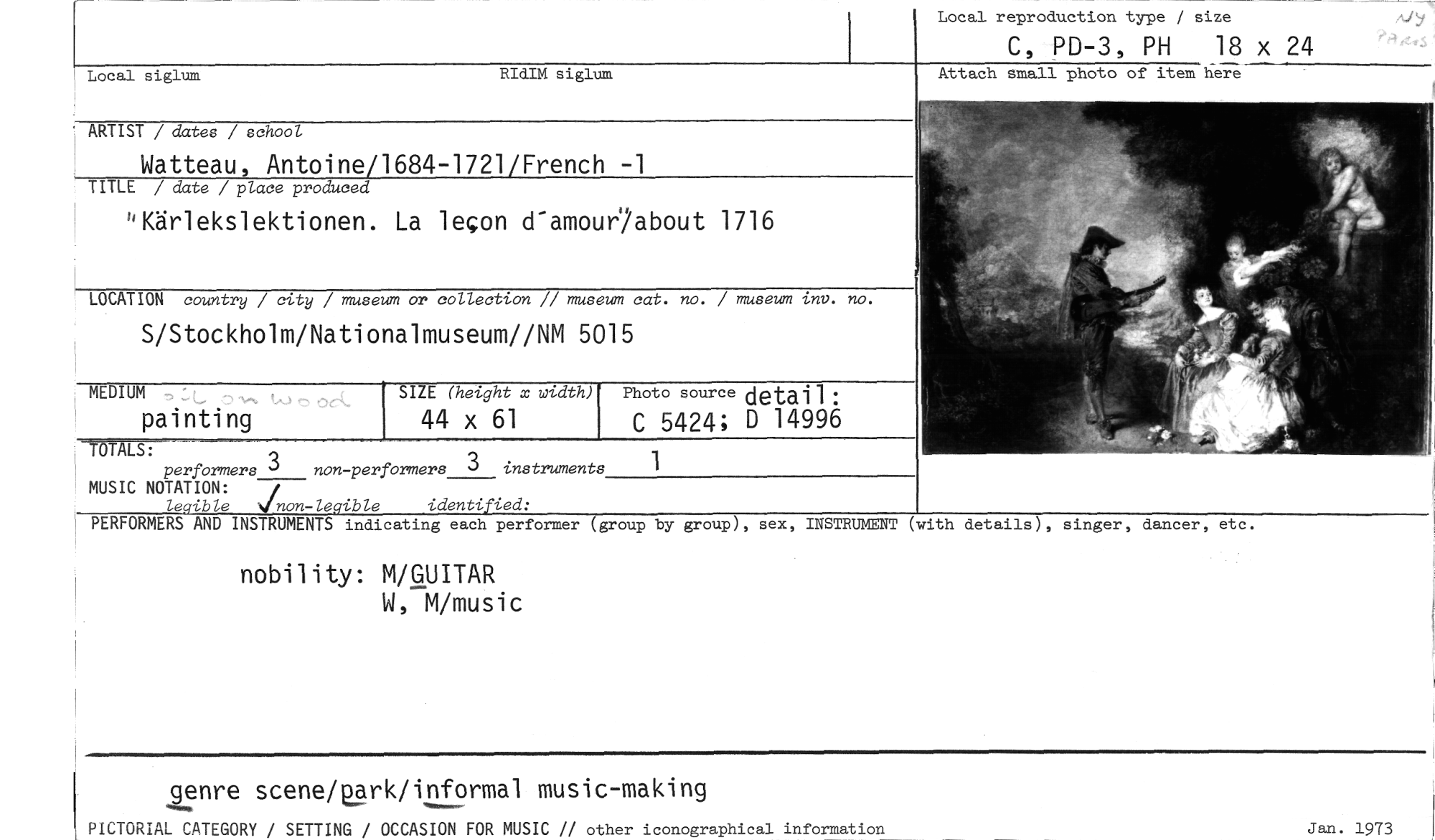 //// nobility: M/GUITAR //// W, M/music //// genre scene/eark/informal music-making Jan. 1973 //// PICTORIAL CATEGORY / SETTING / OCCASION FOR MUSIC // other iconographical information //// //// (with details), singer, dancer, etc. //// PERFORMERS AND INSTRUMENTS indicating each performer (group by group), sex, INSTRUMENT //// Local reproduction type size //// C, PD-3, PH 18 x 24 //// Local siglum RIdIM siglum //// ARTIST / dates / school //// Watteau, Antoine/1684-1721/French -1 //// TITLE / date / place produced //// ''Kärlekslektionen. La lejon Camour2about 1716 //// LOCATION country / city / museum or collection // museum cat. no. / museum inv. no. //// S/Stockholm/Nationalmuseum//NM 5015 //// Attach small photo of item here //// SIZE (height x width) //// 44 x 61 //// TOTALS: //// performers 0 non -performers 3 instruments //// MUSIC NOTATION: //// legible jnon-legible identified: //// Photo source detai 1 C 5424; D 14996 //// 1 //// MEDIUM //// painting ////