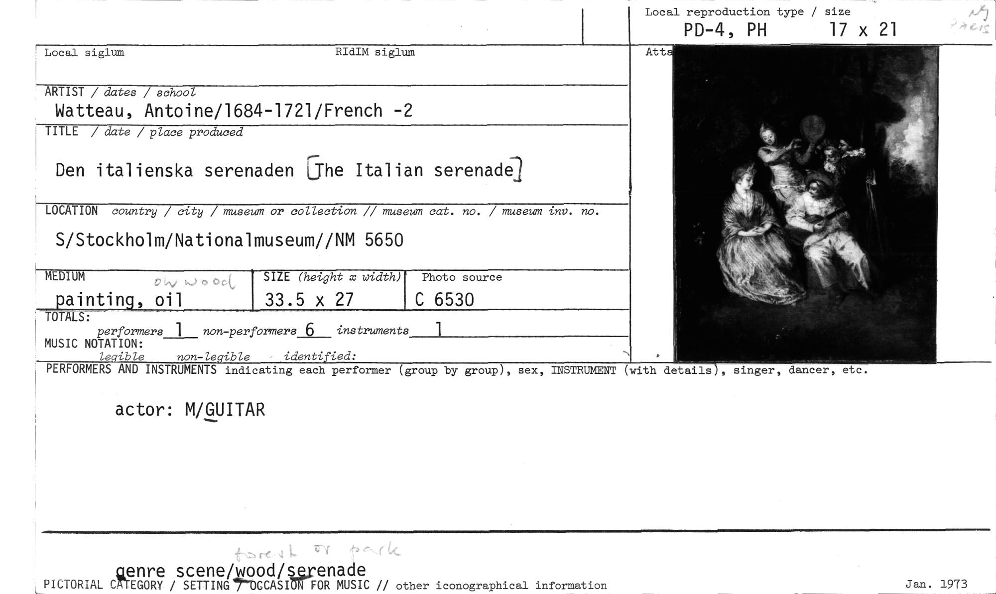 //// Local reproduction type / size //// PD-4, PH 17 x 21 //// Local siglum RIdIM siglum //// ARTIST / dates / school //// Watteau, Antoine/1684-1721/French -2 //// TITLE / date / place produced //// Den italienska serenaden (The Italian serenadej //// LOCATION country / city / museum or collection // museum cat. no. / museum inv. no. //// S/Stockholm/Nationalmuseum//NM 5650 //// MEDIUM //// painting, oil TOTALS: performers 1 non-performers 6 instruments MUSIC NOTATION: //// /e ible non-le ible identi ied: //// PERFORMERS AND INSTRUMENTS //// actor: M/GUITAR //// indicating each performer (group by group), sex, INSTRUMENT (with details), singer, dancer, et //// SIZE (height x width) //// 33.5 x 27 //// Photo source //// C 6530 1 //// genre scene/wood/urenade //// PICTORIAL CATEGORY / SETTINGtUCASIGN FOR MUSIC // other iconographical information //// Jan. 1973 ////