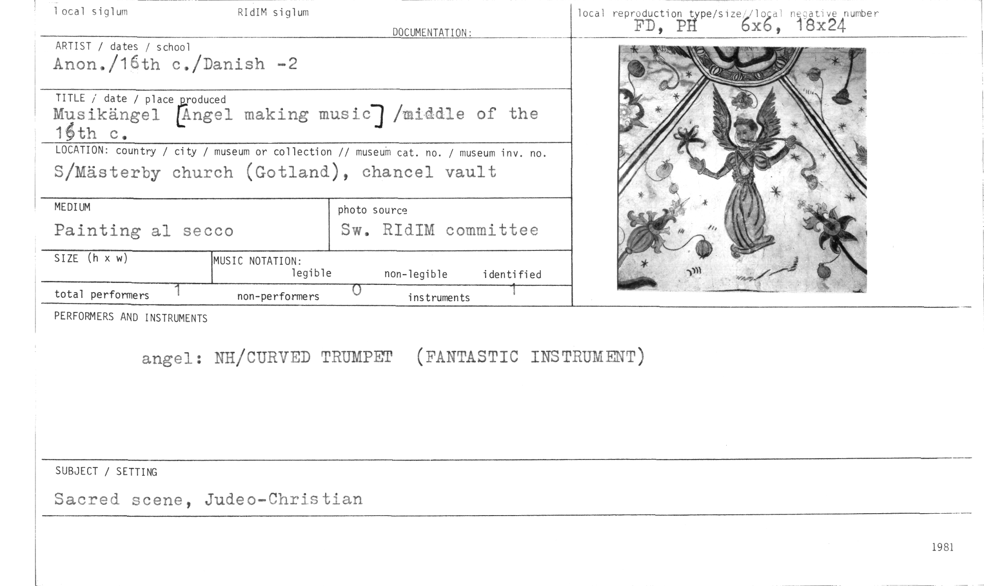 //// 1 otal siglum RIdIM siglum //// DOCUMENTATION: //// ARTIST / dates / school //// Anon./l6th c./Danish -2 //// TITLE / date / place roduced //// Musikängel Angel making music] /mi•ddle of the //// t //// 16th c. //// LOCATION: country / city / museum or collection // museum cat. no. / museum inv. no. //// S/Mästerby church (Gotland), chancel vault //// MEDIUM //// Painting al secco //// SIZE (h x w) //// non-legible identified //// total performers 1 lotal reproduction type/size,;/lo-a negative number //// PD, PH bx 18x24 //// MUSIC NOTATION: //// legible //// photo source //// Sw. RIdIM committee //// non-performers //// instruments //// PERFORMERS AND INSTRUMENTS //// angel: NH/CURVED TRUMPET (FANTASTIC INSTRUMENT) //// SUBJECT / SETTING //// Sacred scene, Judeo-Christian //// 1981 ////