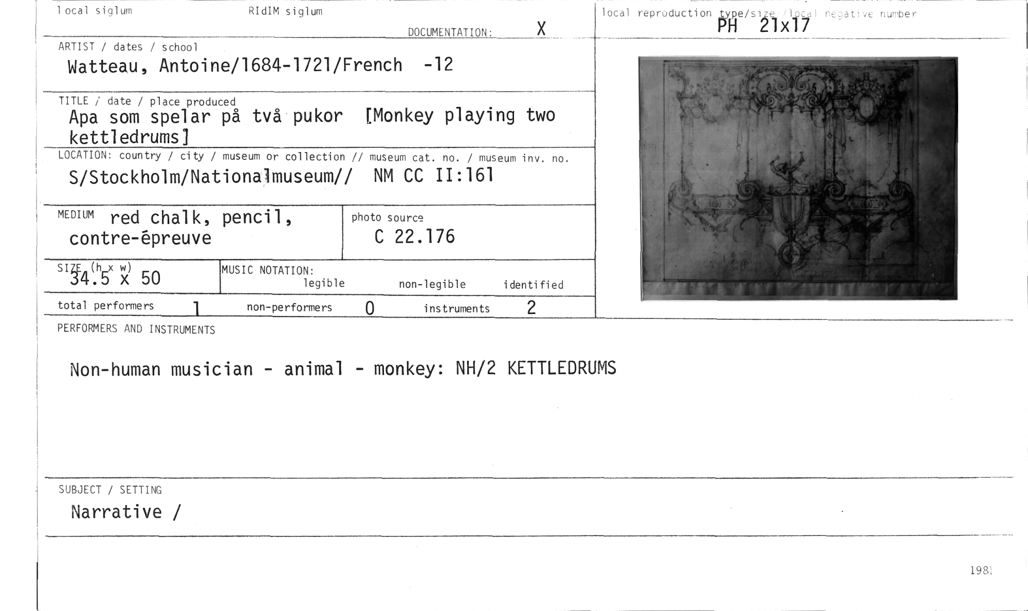 //// non-legible identified //// MUSIC NOTATION: //// legible //// non-performers instruments //// total performers 1 //// 1 ocal siglum RIdIM siglum //// DOCUMENTATION: //// ARTIST / dates / school //// Watteau, Antoine/1684-1721/French -12 //// TITLE / date / place produced //// Apa som spelar på två pukor [Monkey playing two kettledrums] //// LOCATION: country / city / museum or collection // museum cat. no. / museum inv. no. //// S/Stockholm/Nationalmuseum// NM CC 11:161 //// photo source //// C 22.176 //// sig4(h5x 1)42 50 //// MEDIUM red chalk, pencil, //// contre-4reuve //// 2 //// PERFORMERS AND INSTRUMENTS //// Non-human musician - animal - monkey: NH/2 KETTLEDRUMS //// SUBJECT / SETTING //// Narrative / //// lotal reproduction Iype/si2e,itocal negative number //// PH 2 1x17 ////