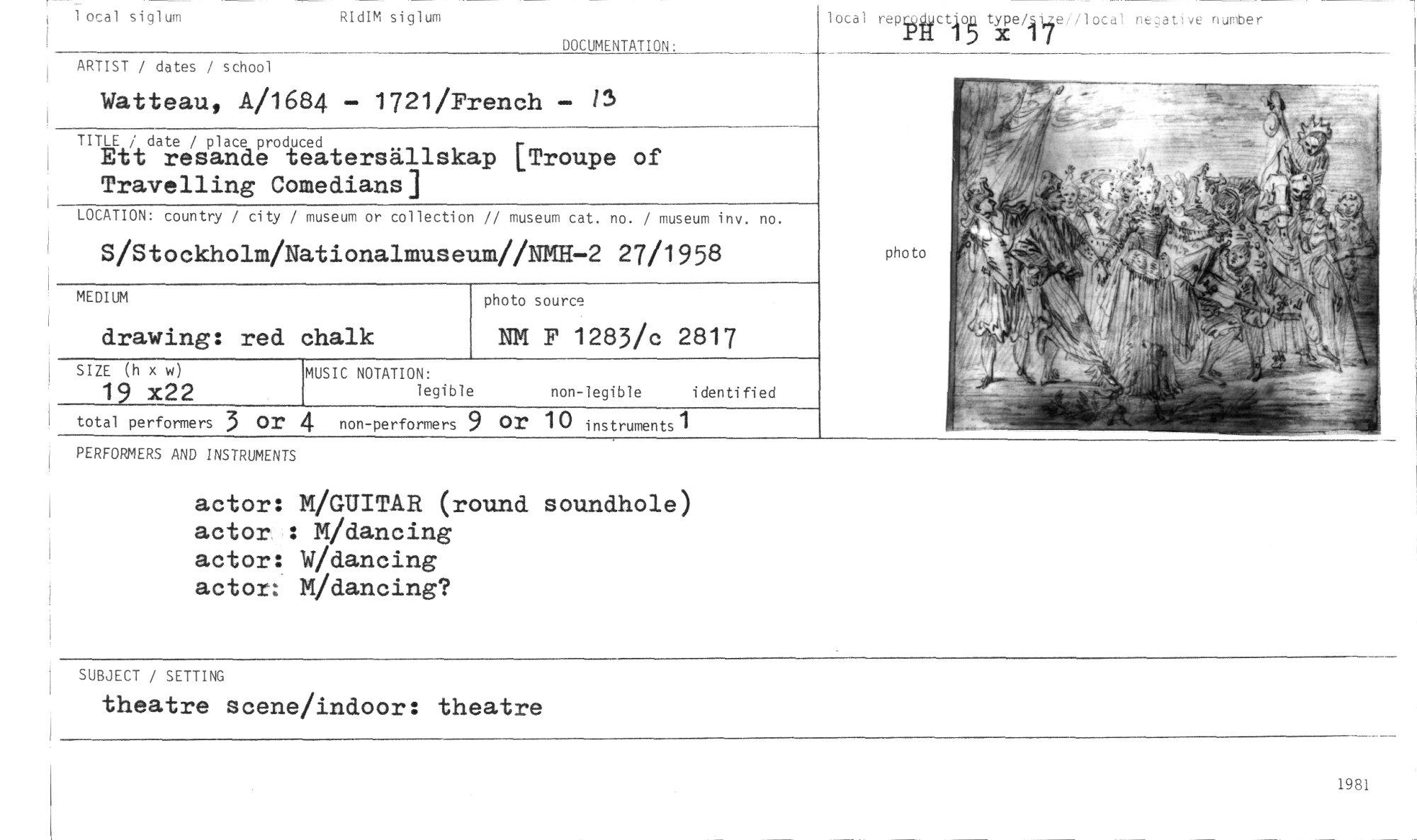 //// actor: M/GUITAR (round soundhole) actor : M/dancing //// actor: W/dancing //// actor: M/dancing? //// SUBJECT / SETTING //// theatre scene/indoor: theatre //// photo source //// NM F 1283/c 2817 //// drawing: red chalk //// MEDIUM //// lotal siglum //// ARTIST / dates / school //// RIdIM siglum //// Watteau, A/1684 - 1721/French - 13 //// TITLE / date / place produced //// Ett resande teatersällskap [Troupe of Travelling Domedians] //// LOCATION: country / city / museum or collection // museum cat. no. / museum inv. no. //// S/Stockholm/Nationalmuseum//NMH-2 27/1958 //// photo //// SIZE (h x w) //// 19 x22 //// total performers //// PERFORMERS AND INSTRUMENTS //// MUSIC NOTATION: //// legible non-legible identified //// lotal repisrti1on tyPe/i //// X1tze//local number //// DOCUMENTATION: //// non-performers 9 or 10 instruments 1 //// 1981 ////
