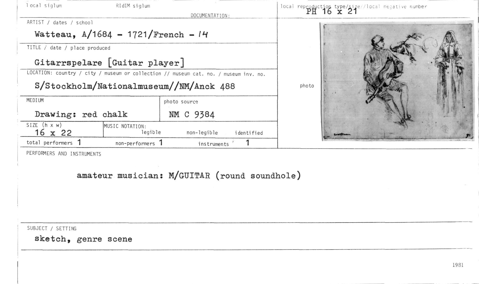 //// lotal repisficti1 typ e/ typ 1e/I;e//local negativ number //// 1 ocal siglum RIdIM siglum //// DOCUMENTATION: //// ARTIST / dates / school //// Watteau, A/1684 - 1721/French -141 //// TITLE / date / place produced //// Gitarrspelare [Guitar piayer] //// LOCATION: country / city / museum or collection // museum cat. no. / museum inv. no. //// S/Stockholm/Nationalmuseum//NM/Anck 488 //// photo source //// Drawing: red chalk //// SIZE (h x w) //// 16 x 22 //// total performers 1 non-performers 1 instruments 1 //// MEDIUM //// MUSIC NOTATION: //// legible //// NM c 9384 //// non-legible identified //// photo //// lad //// PERFORMERS AND INSTRUMENTS //// amateur musician: M/GUITAR (round soundhole) //// SUBJECT / SETTING //// sketch, genre scene //// 1981 ////