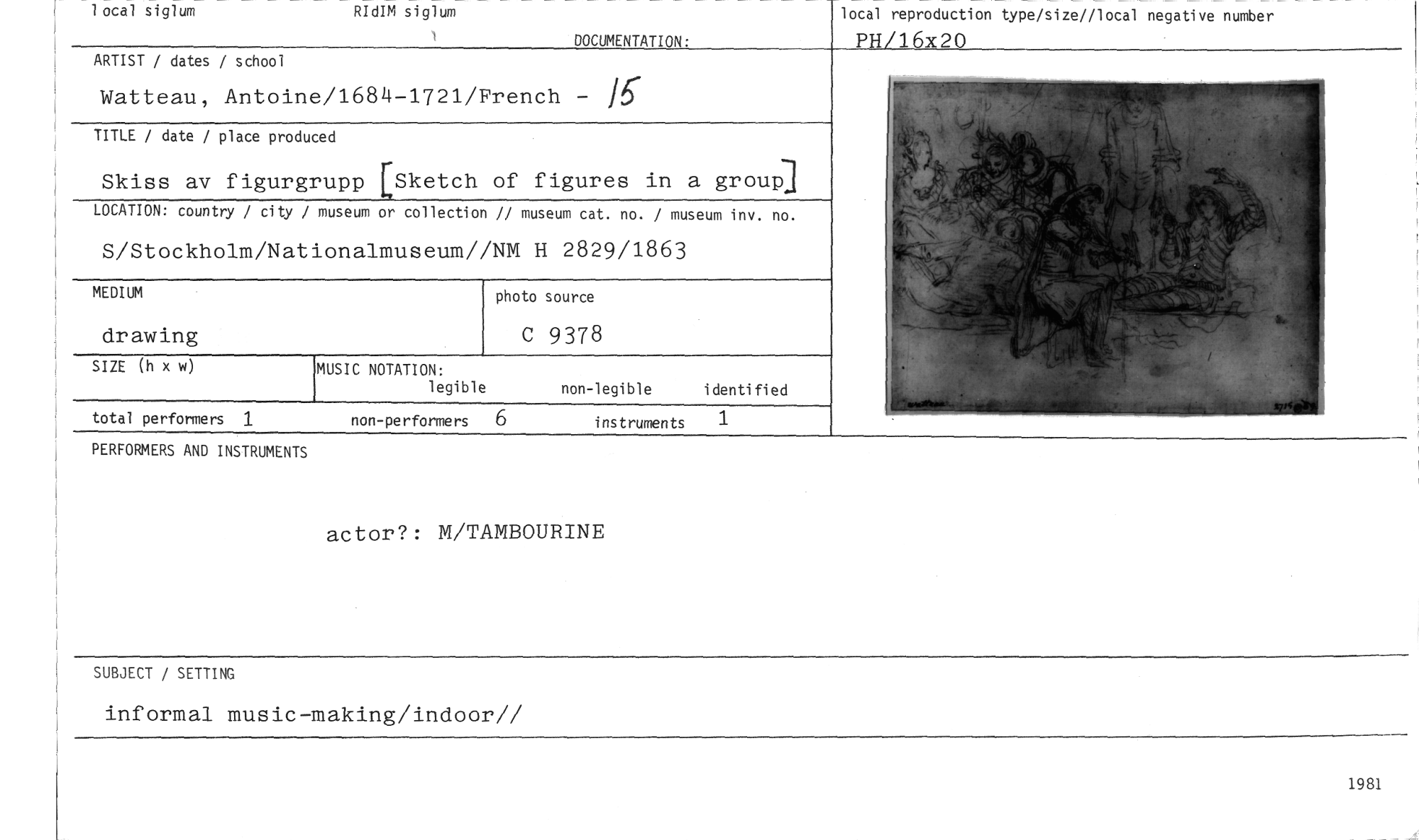 //// local siglum RIdIM siglum //// DOCUMENTATION. //// local reproduction type/size//local negative number //// PH/16x20 //// ARTIST / dates / school //// Watteau, Antoine/1684-1721/French - //// TITLE / date / place produced //// Skiss av figurgrupp [Sketch of figures in a group //// LOCATION: country / city / museum or collection // museum cat. no. / museum inv. no. //// S/Stockholm/Nationalmuseum//NM H 2829/1863 //// MEDIUM //// drawing //// SIZE (h x w) //// MUSIC NOTATION: //// legible non-legible identified //// photo source //// C 9378 //// total performers 1 non-performers 6 instruments 1 //// PERFORMERS AND INSTRUMENTS //// actor?: M/TAMBOURINE //// SUBJECT / SETTING //// informal music-making/indoor// //// 1981 ////