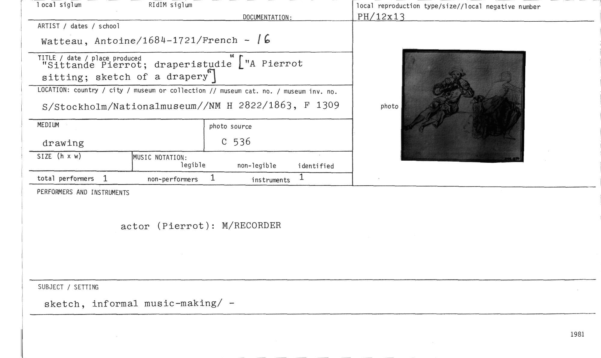 //// local siglum RIdIM siglum //// DOCUMENTATION: //// local reproduction type/size//local negative number //// PH/12x13 //// ARTIST / dates / school //// Watteau, Antoine/1684-1721/French - IG //// TITLE / date / place produced r //// "Sittande Pierrot; draperistudie L"A Pierrot sitting; sketch of a draperyl //// LOCATION: country / city / museum or collection // museum cat. no. / museum inv. no. //// S/Stockholm/Nationalmuseum//NM H 2822/1863, F 1309 //// MEDIUM photo source //// drawing C 536 //// SIZE (h x w) MUSIC NOTATION: non-legible identified //// legible //// total performers 1 non-performers 1 instruments 1 //// PERFORMERS AND INSTRUMENTS //// actor (Pierrot): M/RECORDER //// photo //// SUBJECT / SETTING //// sketch, informal music-making/ - //// 1981 ////