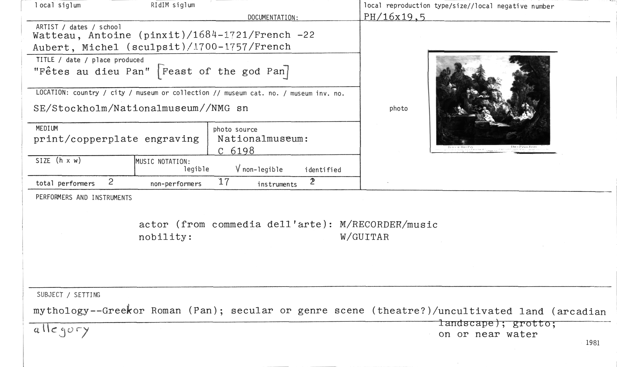 //// r 1 ocal siglum RIdIM siglum //// DOCUMENTATION: //// local reproduction type/size//local negative numer //// PH/16x19,5 //// ARTIST / dates / school //// Watteau, Antoine (pinxit)/1684-1721/French -22 Aubert, Michel (sculpsit)/1700-1757/French //// TITLE / date / place produced //// "Fetes au dieu Pan" [Feast of the god Pan //// LOCATION: country / city / museum or collection // museum cat. no. / museum inv. no. //// SE/Stockholm/Nationalmuseum//NMG sn //// MEDIUM //// print/copperplate engraving //// photo source //// Nationalmuseum: //// C 6198 //// photo //// SIZE (h x w) //// MUSIC NOTATION: //// legible //// V non-legible identified //// total performers 2 non-performers 17 instruments 2 //// PERFORMERS AND INSTRUMENTS //// actor (from commedia dell'arte): M/RECORDER/music nobility: W/GUITAR //// SUBJECT / SETTING //// mythology--Greekor Roman (Pan); secular or genre scene (theatre?)/uncultivated land (arcadian //// . • //// • //// - e //// on or near water //// 7ITIC jo 7 //// 1981 ////