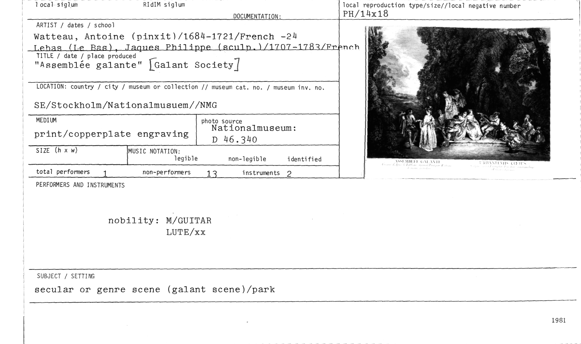 //// RIdIM siglum //// DOCUMENTATION: //// local reproduction type/size//local negative number //// PH/14x18 //// ARTIST / dates / school //// Watteau, Antoine (pinxit)/1684-1721/French —24 //// (T,e Bas), JacluPS Pkilippe (scuip.1/1707-178VPr TITLE / date / place produced //// "Assemblee galante" [Galant Society] //// LOCATION: country / city / museum or collection // museum cat. no. / museum inv. no. //// SE/Stockholm/Nationalmusuem//NMG //// MEDIUM //// print/copperplate engraving //// SIZE (h x w) //// non-legible identified //// total performers 1 non-performers 13 instruments 2 //// MUSIC NOTATION: //// legible //// photo source //// Nationalmuseum: D 46.340 //// nrh //// PERFORMERS AND INSTRUMENTS //// nobility: M/GUITAR //// LUTE/xx //// SUBJECT / SETTING //// secular or genre scene (galant scene)/park //// 1981 ////