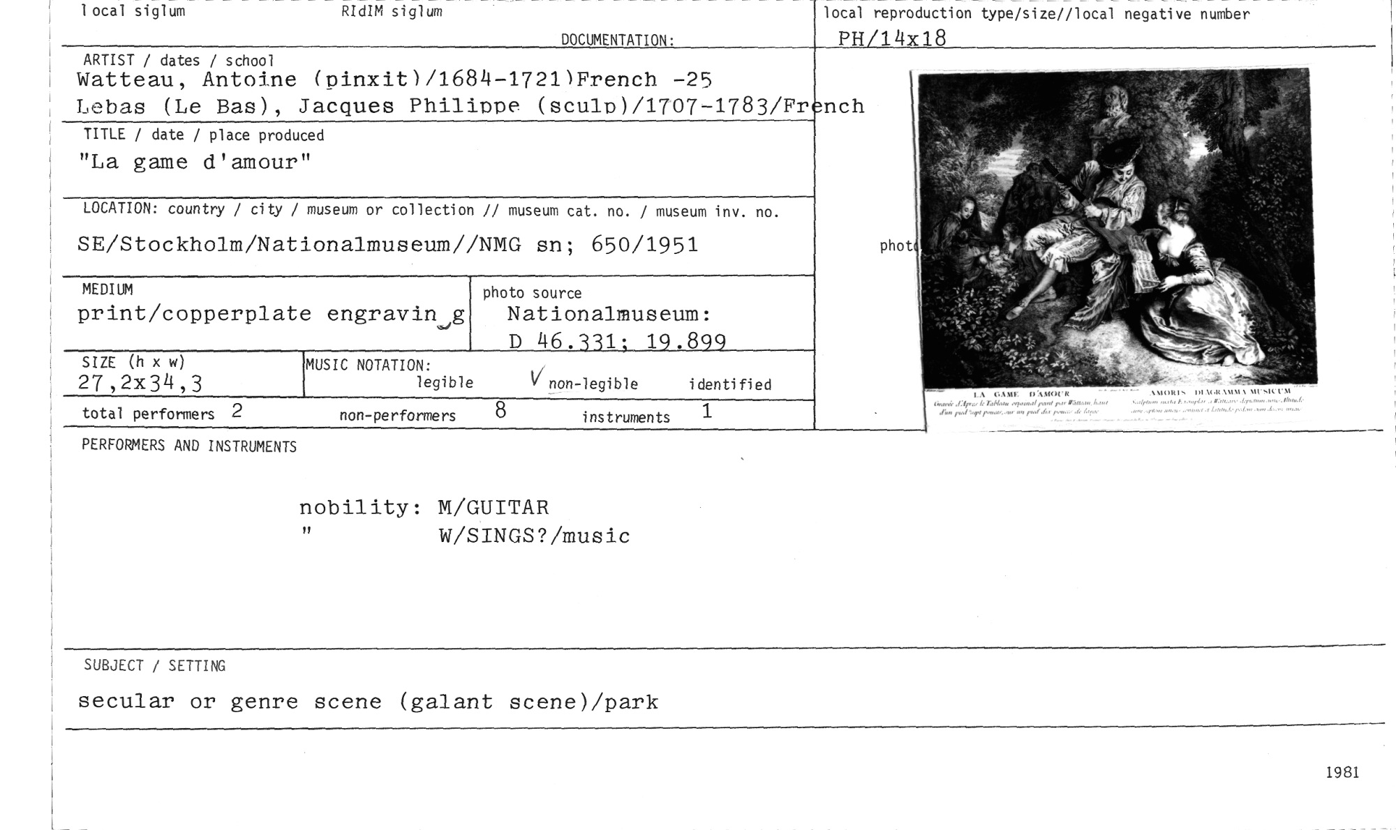 //// PERFORMERS AND INSTRUMENTS //// nobility: M/GUITAR //// ” W/SINGS?/music //// SUBJECT / SETTING //// secular or genre scene (galant scene)/park //// 1981 //// 1 ocal siglum //// RIdIM siglum //// DOCUMENTATION: //// local reproduction type/size//local negative number //// PH/14x18 //// ARTIST / dates / school //// Watteau, Antoine (ninxit)/1684-17211French -25 //// Lebas (Le Bas), Jacques Philippe (sculn)/1707-1783/Fr3nch //// TITLE / date / place produced //// "La game d' amour" //// LOCATION: country / city / museum or collection // museum cat. no. / museum inv. no. //// SE/Stockholm/Nationalmuseum//NMG sn; 650/1951 //// MEDIUM photo source //// print/copperplate engravinA Nationalmuseum: //// D 46.331; 19.899 //// phot //// SIZE (h x w) //// 27,23(34,3 //// MUSIC NOTATION: //// legible //// V non-legible identified //// total performers 2 //// non-performers u instruments //// 1 ////