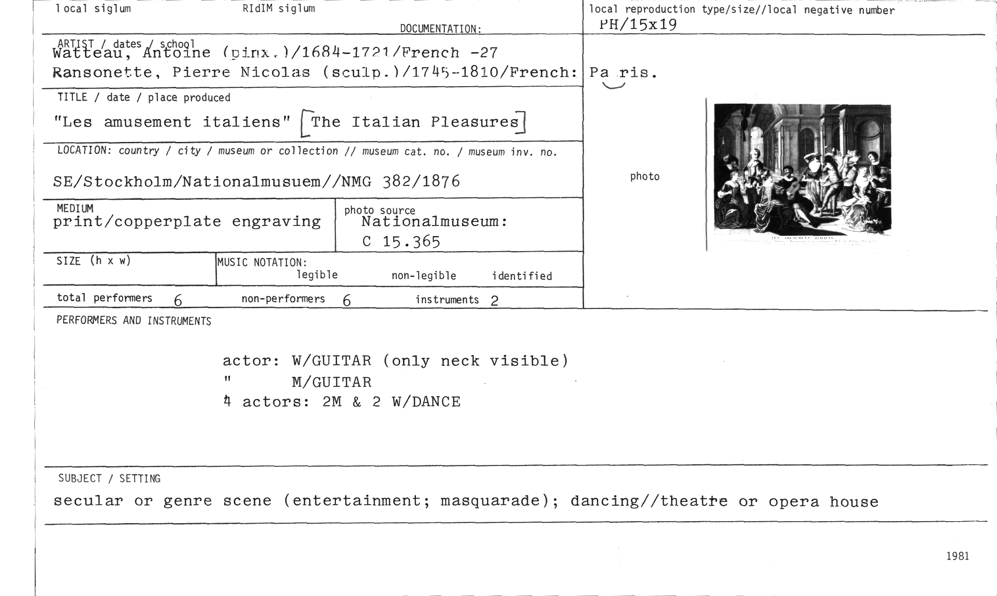 //// SIZE (h x w) //// MUSIC NOTATION: //// local siglum //// RIdIM siglum //// DOCUMENTATION: //// local reproduction type/size//local negative numberPH/15X19 //// daTeladaurs J Antoine Anstoine (pinx.)/1684-1721/French -27 //// Ransonette, Pierre Nicolas (sculp.'i/1745--1810/French: Paris. //// TITLE / date / place produced //// "Les amusement italiens" [The Italian Pleasures] //// LOCATION: country / city / museum or collection // museum cat. no. / museum inv. no. //// SE/Stockholm/Nationalmusuem//NMG 382/1876 //// MEDIUM //// print/copperplate engraving //// photo //// photo source //// Nationalmuseum: C 15.365 //// legible non-legible identified //// total performers 6 non-performers 6 instruments 2 //// PERFORMERS AND INSTRUMENTS //// actor: W/GUITAR (only neck visible) “ M/GUITAR //// 4 actors: 2M & 2 W/DANCE //// SUBJECT / SETTING //// secular or genre scene (entertainment; masquarade); dancing//theat•e or opera house //// 1981 ////