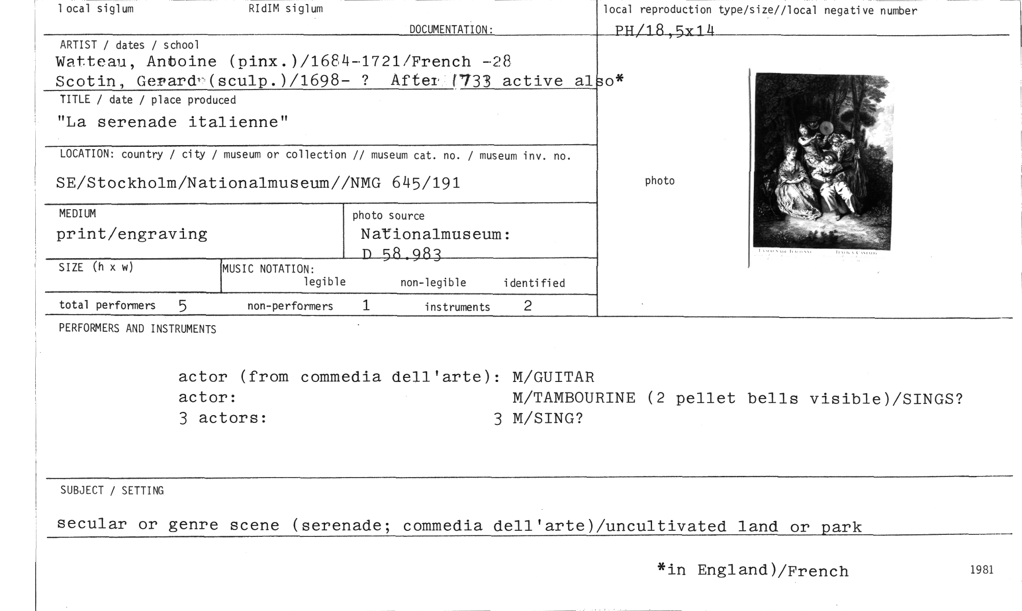 //// 1 ocal siglum RIdIM siglum DOCUMENTATION. local reproduction type/size//local negative nutuber //// PR/18,5y14 //// //// //// ARTIST / dates / school //// Watteau, Antoine (pinx.)/1684-1721/French -28 //// Scotin, Gerard-(sculp.)/1698- ? After (733 active allo* //// TITLE / date / place produced //// "La serenade italienne" //// LOCATION: country / city / museum or collection // museum cat. no. / museum inv. no. //// SE/Stockholm/Nationalmuseum//NMG 645/191 //// MEDIUM //// print/engraving //// photo source //// Nationalmuseum: //// n 52.983 //// SIZE (h x w) //// MUSIC NOTATION: //// legible non-legible identified //// photo //// //// total performers 5 non-performers 1 instruments 2 //// PERFORMERS AND INSTRUMENTS //// actor (from commedia dell'arte): M/GUITAR //// actor: M/TAMBOURINE (2 pellet bells visible)/SINGS? //// 3 actors: 3 M/SING? //// SUBJECT / SETTING //// secular or genre scene (serenade; commedia dell'arte)/uncultivated land or park //// *in England)/French 1981 ////