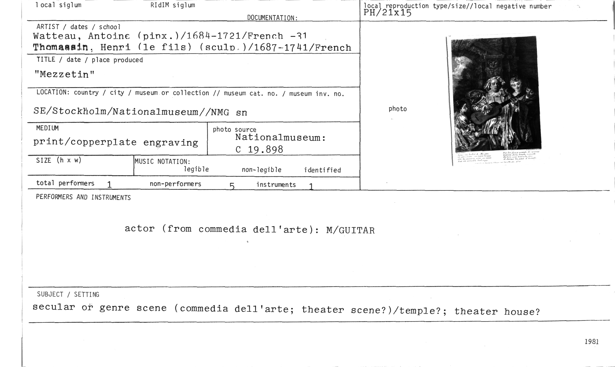 //// 1 otal siglum RIdIM siglum //// DOCUMENTATION' //// local reproduction type/size//local negative number //// PH/21x15 //// ARTIST / dates / school //// Watteau, Antoine (pinx.)/1684-1721/French -31 Thomaesin, Henri (le fils) (sculp1/1687-1741/French //// TITLE / date / place produced //// "Mezzetin" //// LOCATION: country / city / museum or collection // museum cat. no. / museum inv. no. //// SE/Stockholm/Nationalmuseum//NMG sn //// photo source //// Nationalmuseum: C 19.898 //// SIZE (h x w) //// total performers 1 non-performers 5 instruments 1 //// MEDIUM //// print/copperplate engraving //// MUSIC NOTATION: //// legible non-legible identified //// photo //// PERFORMERS AND INSTRUMENTS //// actor (from commedia dell'arte): M/GUITAR //// SUBJECT / SETTING //// secular or genre scene (commedia dell'arte; theater scene?)/temple?; theater house? //// 1981 ////