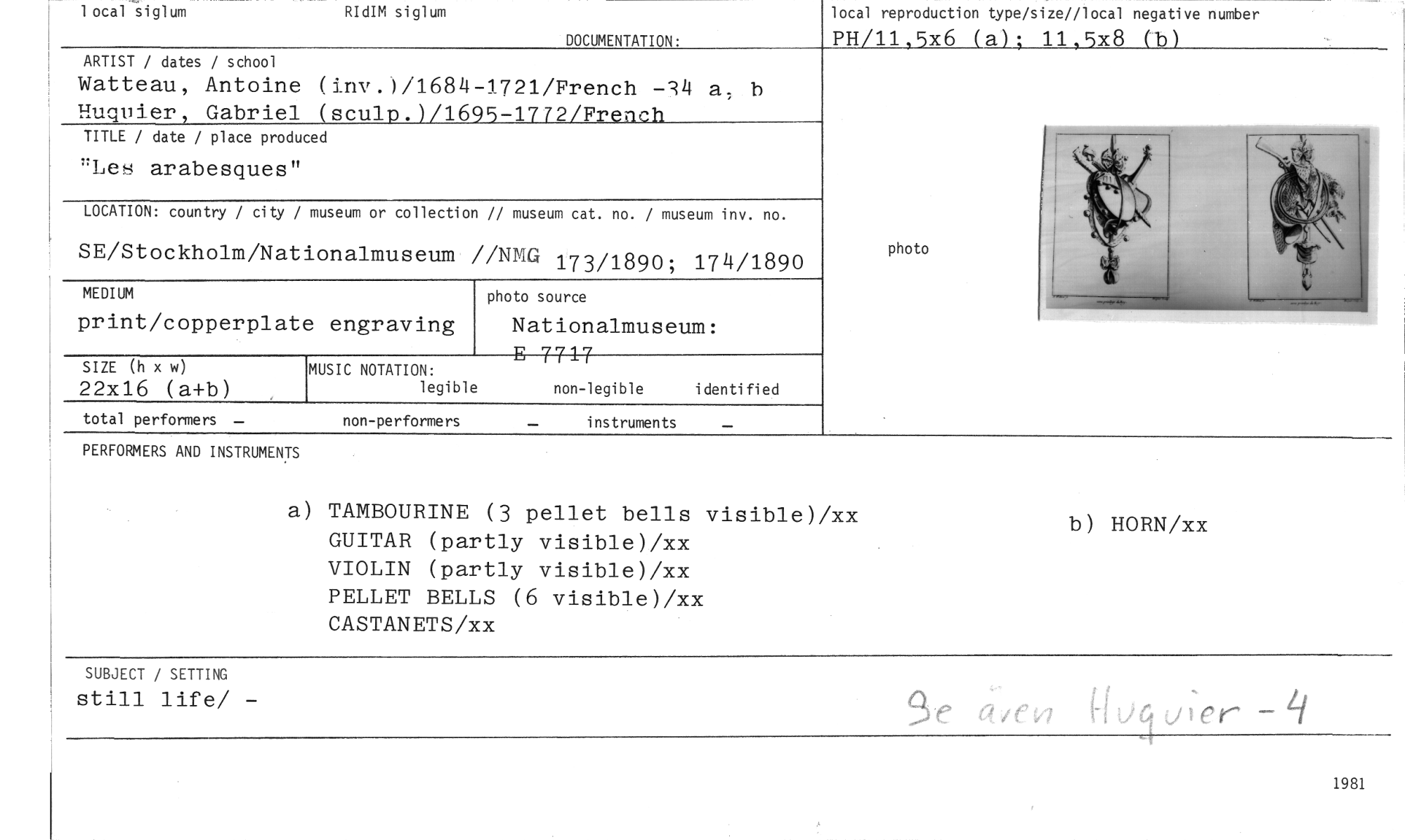 //// lotal reproduction type/size//local negative number //// PR/11.5x6 (a); 11,5x8 (b) //// 1 ocal siglum RIdIM siglum //// DOCUMENTATION //// ARTIST / dates / school //// Watteau, Antoine (inv.)/1684-1721/Prench -34 a, b //// Huquier, Gabriel (sculo.)/1695-1772/French //// TITLE / date / place produced //// "Les arabesques" //// LOCATION: country / city / museum or collection // museum cat. no. / museum inv. no. //// SE/Stockholm/Nationalmuseum //NMG 173/1890; 174/1890 //// MEDIUM //// print/copperplate engraving //// SIZE (h x w) //// 22x16 (a+b) //// MUSIC NOTATION: //// legible //// photo source //// Nationalmuseum: //// E-7717 //// non-legible identified //// photo //// total performers — non-performers instruments //// PERFORMERS AND INSTRUMENTS //// a) TAMBOURINE (3 pellet bells visible)/xx b) HORN/xx //// GUITAR (partly visible)/xx VIOLIN (partly visible)/xx PELLET BELLS (6 visible)/xx CASTANETS/xx //// SUBJECT / SETTING Se a,c'i u ty-er //// still life/ - //// 1981 ////