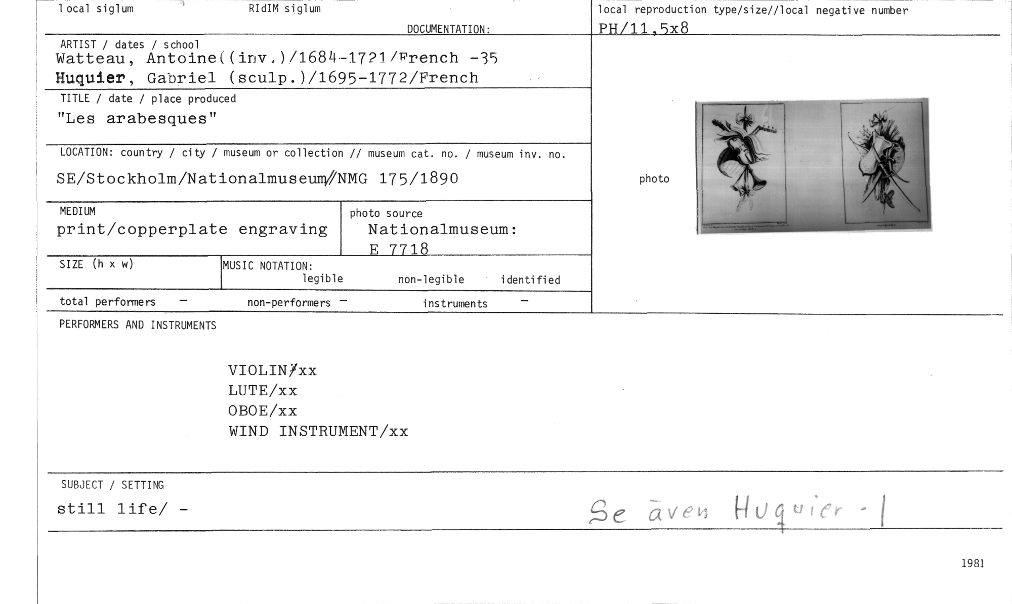 //// local siglum RIdIM siglum //// DOCUMENTATION: //// local reproduction type/size//local negative number //// PH/11,5x8 //// ARTIST / dates / school //// Watteau, Antoine((inv.)/1684•1721/Prench -35 Huquier, Gabriel (sculp.)/1695-1772/French //// TITLE / date / place produced //// "Les arabesques" //// LOCATION: country / city / museum or collection // museum cat. no. / museum inv. no. //// SE/Stockholm/Nationalmuseum/MMG 175/1890 //// //// MEDIUM photo source //// print/copperplate engraving Nationalmuseum: //// E 7718 //// //// //// //// //// photo //// //// SIZE (h x w) //// MUSIC NOTATION: //// legible non-legible identified //// total performers non-performers instruments //// PERFORMERS AND INSTRUMENTS //// VIOLINXxx //// LUTE/xx OBOE/xx WIND INSTRUMENT/xx //// SUBJECT / SETTING Se avec f-luquiser -1 //// still life/ - //// //// 1981 ////
