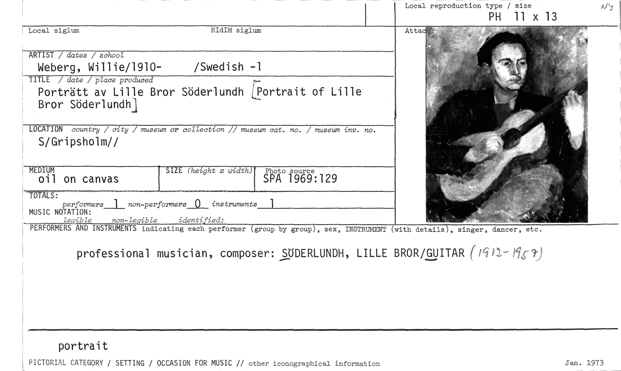 //// Local reproduction type / size //// PH 11 x 13 //// Local siglum RIdIM siglum //// Atta //// ARTIST / dates / school //// Weberg, Willie/1910- /Swedish -1 //// TITLE / date / place produced //// Porträtt av Lille Bror Söderlundh jortrait of Lille Bror Söderlundhj //// LOCATION country / city / museum or collection // museum cat. no. / museum inv. no. //// S/Gripsholm// //// TOTALS: //// performers 1 non-performers 0 instruments 1 MUSIC NOTATION: //// legible non-legible identified: //// PERFORMERS AND INSTRUMENTS indicating each performer (group by group), sex, INSTRUMENT (with details), singer, dancer, etc. //// professional musician, composer: SÖDERLUNDH, LILLE BROR/GUITAR (6)2-6(99 //// portrait //// PICTORIAL CATEGORY / SETTING / OCCASION FOR MUSIC // other iconographical information //// Jan. 1973 //// gn° source 1969:129 //// SIZE (height x width) //// MEDIUM //// oil on canvas ////