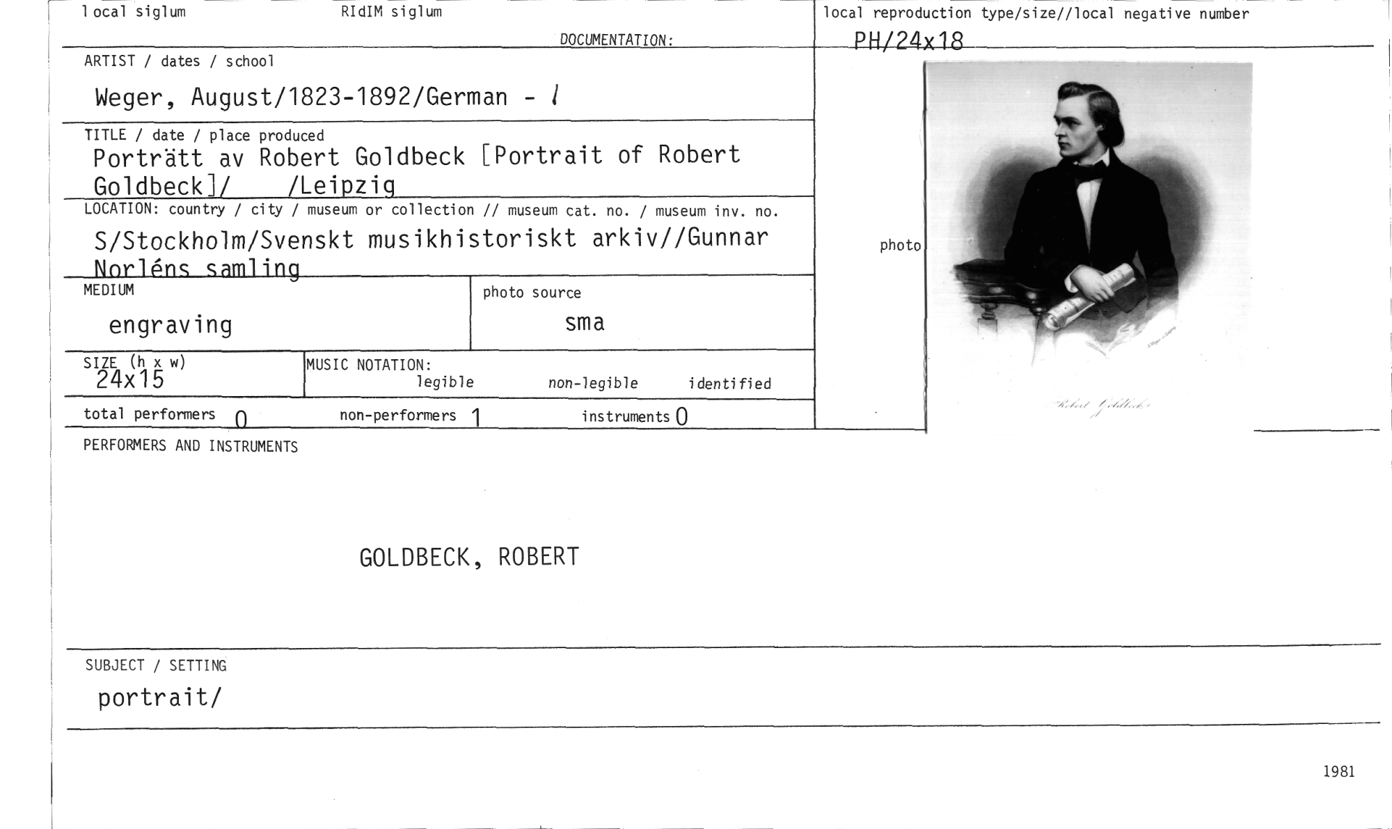 //// 1 ocal siglum RIdIM siglum //// local reproduction type/size//local negative number //// PH/24x18 //// DOCUMENTATION: //// ARTIST / dates / school //// Weger, August/1823-1892/German - i //// TITLE / date / place produced //// Porträtt av Robert Goldbeck [Portrait of Robert //// Goldbece/ /Leipzig //// LOCATION: country / city / museum or collection // museum cat. no. / museum inv. no. //// S/Stockholm/Svenskt musikhistoriskt arkiv//Gunnar //// Nn1-16ns samling //// MEDIUM //// engrav ing //// MUSIC NOTATION: //// legible non-legible identified //// photo //// //// photo source //// sma //// SIZE (h x //// 24x15 //// total performers non-performers 1 instruments 0 //// PERFORMERS AND INSTRUMENTS //// GOLDBECK, ROBERT //// SUBJECT / SETTING //// portrait/ //// 1981 ////