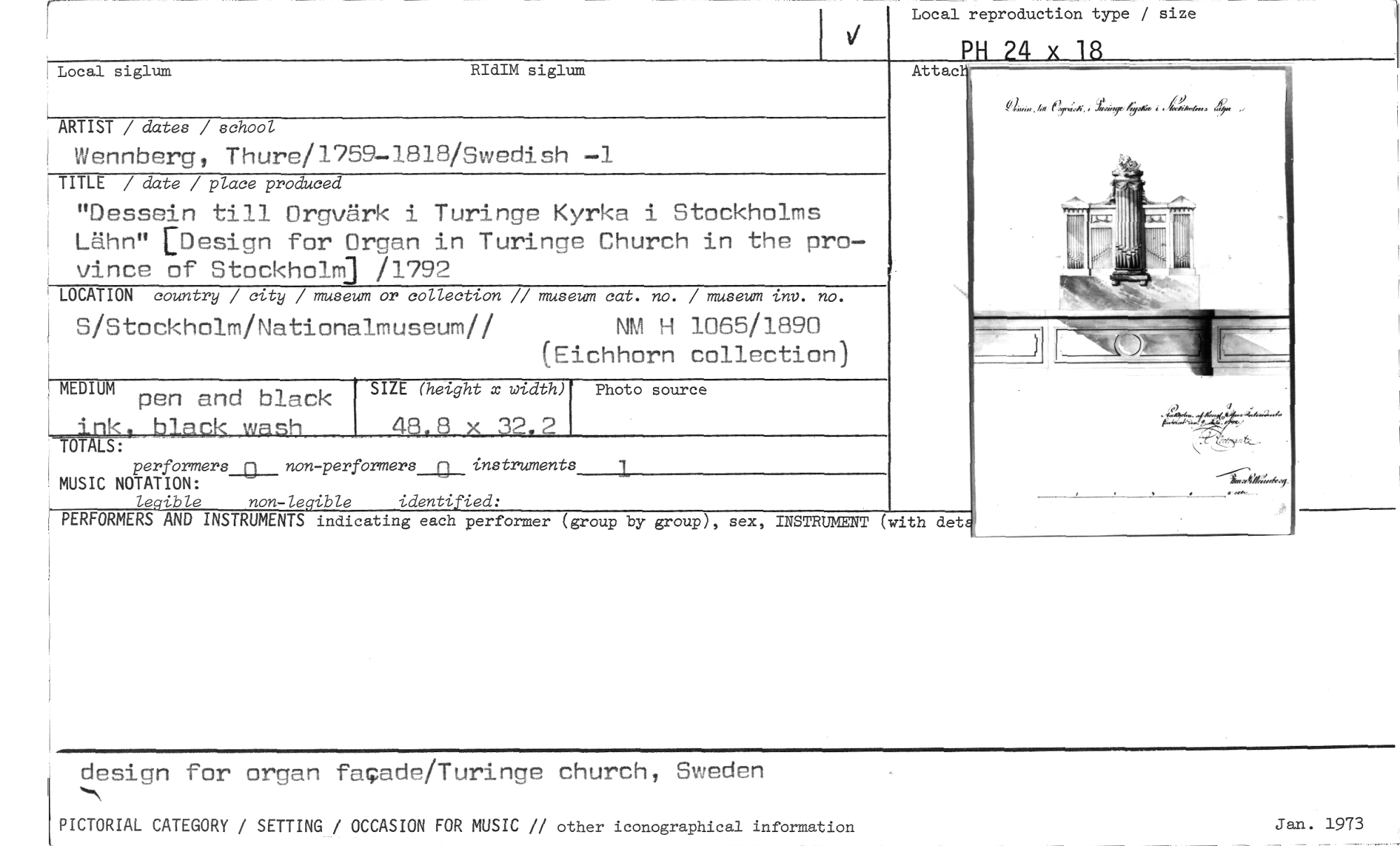 //// Local reproduction type / size //// PH 24 x 18 //// otal siglum RIdIM siglum //// ARTIST / dater / school //// Wennberg, Thure/1759-1818/Swedish -1 //// TITLE / date / place produced //// "Dessein till Orgvärk i Turinge Kyrka i Stockholms Lähn" [Design for Organ in Turinge Church in the province of StockholM1 /1792 //// LOCATION country / city / museum or collection // museum cat. no. / museum inv. no. //// S/Stockholm/Nationalmuseum// NM H 1065/1890 //// (Eichhorn collection) //// Attac //// MEDIUM pen and black //// SIZE (height x width) //// Photo source //// 48.0 x 32.2 //// uknk, ALS: black wash performers_c__ non -performers__a_instruments 1 //// MUSIC NOTATION: //// legibie non-legible identified: //// PERFORMERS AND INSTRUMENTS indicating each performer (group by group), sex, INSTRUMENT (with det //// design for organ faade/Turinge church, Sweden //// PICTORIAL CATEGORY / SETTING / OCCASION FOR MUSIC // other iconographical information Jan. 1973 ////