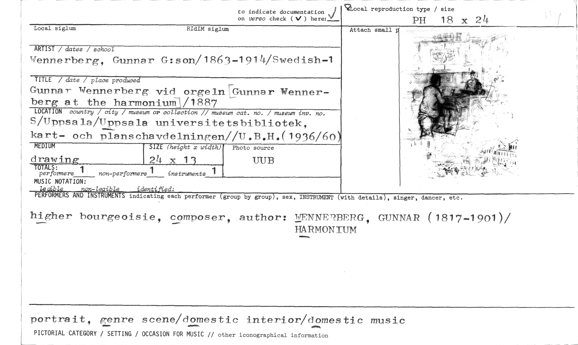 //// to indicate documentation gLocal reproduction type / size //// on verso check (V) here:.__ //// PH 18 x 24 //// Local siglum RIdIM siglum //// ARTIST / dates / school //// Vennerberg, Gunnar G:son/1863-1914/Swedish-1 //// TITLE / date / place produced //// Gunnar Vennarberg vid orgeln',.Gunnar Wennerberg at the harmonium/1887 //// LOCATION country / city / museum or collection // museum cat. no. / museum inv. no. //// S/Uppsala/Uppsala universitetsbibliotek, kart- och planschavdelningen//U.B.H.(1936/60) //// MEDIUM SIZE (height x width) Photo source //// drawing //// perfbrmers non-performers 1 instruments //// 1 //// MUSIC NOTATION: //// lealble non-locible jdentified: //// indicating each performer (group by group), sex, INSTRUNT (with details-), //// PERFORMERS AND INSTRUMENTS //// singer, dancer, etc. //// Attach small //// 24 x 13 //// UUB //// higher bourgeoisie, composer, author: VENNE'RBERG, GUNNAR (1817-1901)/ //// HARMONIUM //// portrait, genre scene/domestic interior/domestic music //// PICTORIAL CATEGORY / SETTING / OCCASION FOR MUSIC // other iconographical information ////