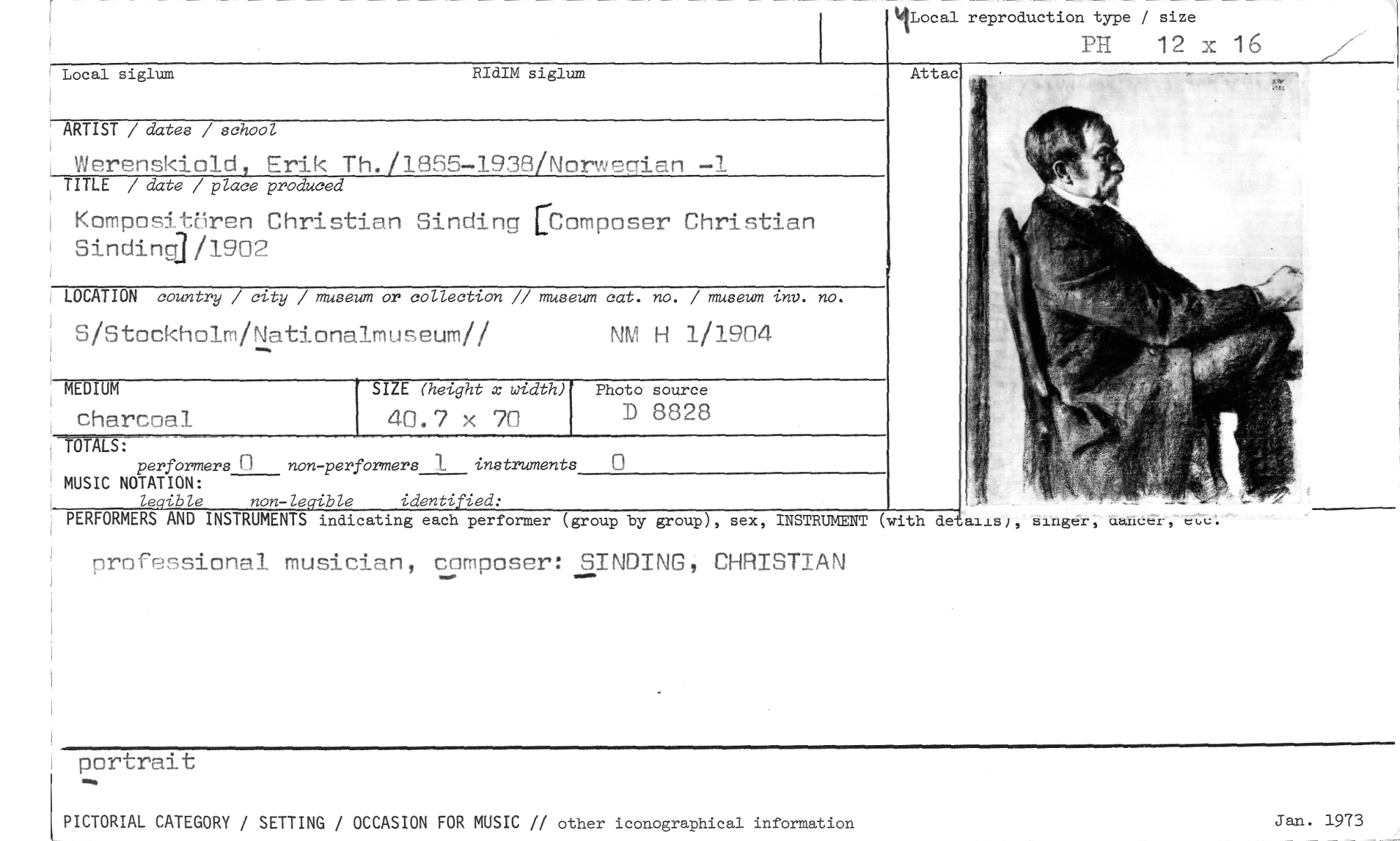//// tjLocal reproduction type / size //// PH 12 x 16 //// Attac //// TITLE / date / place produced //// Kompositören Christian Sinding [Composer Christian Sin ding} /1902 //// LOCATION country / city / museum or collection // museum cat. no. / museum inv. no. //// S/Stockholm/Nationalmuseum// NM H 1/1904 //// MEDIUM SIZE (height x width) //// charcoal 40.? x 70 //// performers n non-perförmers i instruments 0 //// MUSIC NOTATION: //// legible non-legible identified: //// PERFORMERS AND INSTRUMENTS indicating each performer (group by //// professional musician, composer: SINDING, CHRISTIAN //// Local siglum RIdIM siglum //// ARTIST / dates / school //// Werenskiold, Erik Th./1865-1938/Norwedian -1 //// Photo source //// D 8828 //// group), sex, INSTRUMENT (with detaiis,, Singer, uuncer, eue. //// portrait //// PICTORIAL CATEGORY / SETTING / OCCASION FOR MUSIC // other iconographical information Jan. 1973 ////