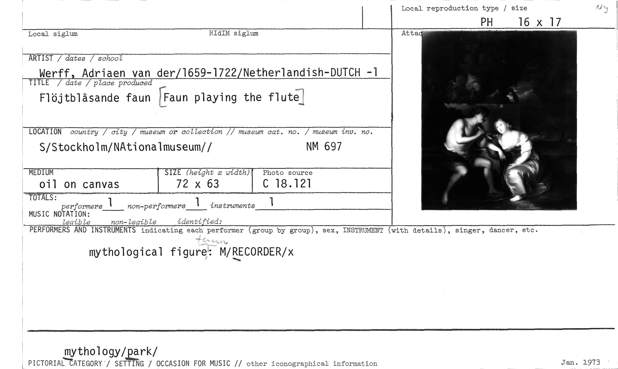 //// Local reproduction type i size //// PH 16 x 17 //// Local siglum RIdIM siglum //// ARTIST / dates / school //// Werff, Adriaen van der/1659-1722/Netherlandish-DUTCH -1 //// TITLE / date / place produced //// Flöjtblåsande faun Faun playing the flutet //// LOCATION country / city / museum or collection // museum cat. no. / museum inv. no. //// S/Stockholm/NAtionalmuseum// NM 697 //// MEDIUM SIZE (height x width) Photo source //// oil on canvas 72 x 63 C 18.121 //// //// 1 //// Atta //// details), singer, dancer, etc. //// x, INSTRUMENT (with //// TÖTALS: //// performers 1 non-performers 1 instruments //// MUSIC NOTATION: //// le ible non-le ible identi ied: //// PERFORMERS AND INSTRUMENTS indicating each performer (group by group), s //// mythological figurer M/RECORDER/x //// t PICTORIArrATEGORY-/ SETTING / OCCASION FOR MUSIC // other iconographical information //// mythology/jerk/ //// Jan. 1973 ////