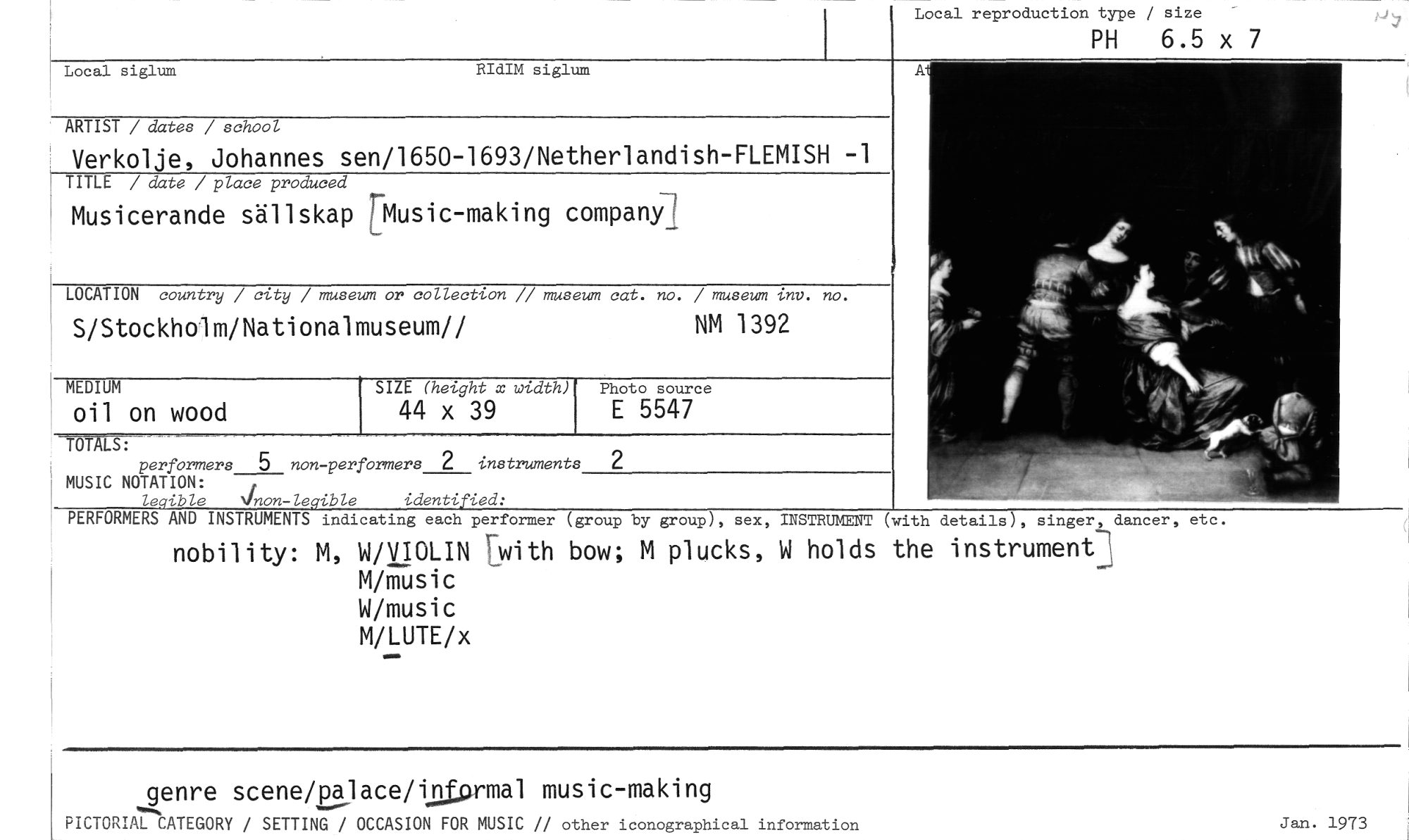 //// Local reproduction type / size //// PH 6.5 x 7 //// Local siglum RIdIM siglum //// ARTIST / dates / school //// Verkolje, Johannes sen/1650-1693/Netherlandish-FLEMISH -1 //// TITLE / date / place produced //// Musicerande sällskap Music-making company //// LOCATION country / city / museum or collection // museum cat. no. / museum inv. no. //// S/Stockholm/Nationalmuseum// NM 1392 //// MEDIUM //// oil on wood //// SIZE (height x width) //// 44 x 39 Photo source //// E 5547 //// TOT LS: performers 5 non-performers 2 instruments 2 //// //// (with details), singer, dancer, etc. //// nobility: M, W/VIOLIN rwith bow; M plucks, W holds the instrument-7 //// J //// M/music W/music M/LUTE/x //// genre scene/palace/inlprmal music-making //// MUSIC NOTATION: i //// legible Vnon-legible identified: //// PERFORMERS AND INSTRUMENTS indicating each performer (group by group), sex, INSTRUMENT //// PICTORIAL CATEGORY / SETTING / OCCASION FOR MUSIC // other iconographical information //// Jan. 1973 ////