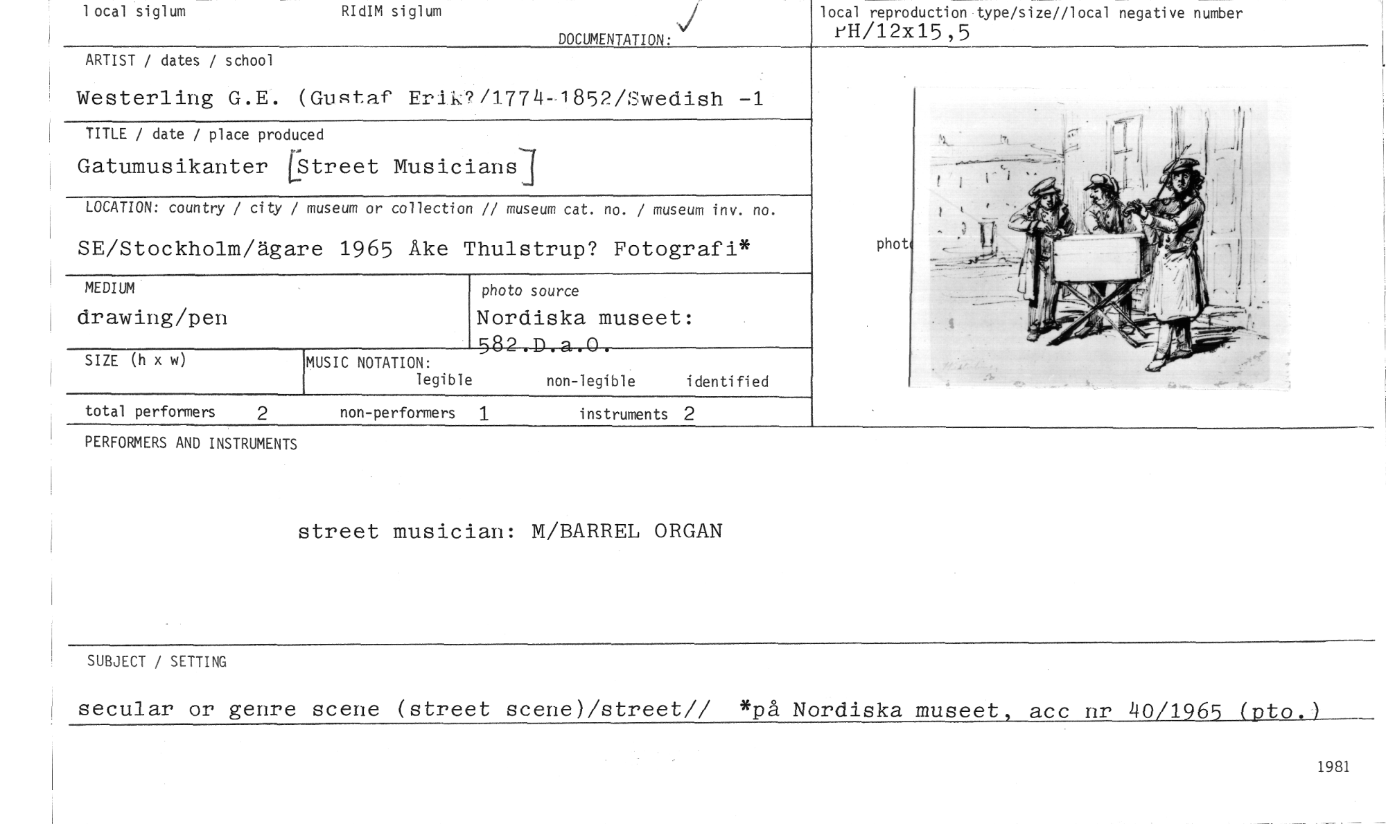 //// 1 ocal siglum RIdIM siglum //// DOCUMENTATION: //// local reproduction type/size//local negative number //// ri4/12x15,5 //// ARTIST / dates / school //// Westerling G.E. (Gustaf Erik1/1774-1852/Swedish -1 //// TITLE / date / place produced //// Gatumusikanter [Street Musicians //// LOCATION: country / city / museum or collection // museum cat. no. / museum inv. no. //// SE/Stockholm/ägare 1965 Åke Thulstrup? Fotografi* //// MEDIUM photo source //// drawing/pen Nordiska museet: 582.D.a.0. //// SIZE (h x w) MUSIC NOTATION: identified //// legible non-legible //// total performers 2 non-performers 1 instruments 2 //// PERFORMERS AND INSTRUMENTS //// phot //// street musician: M/BARREL ORGAN //// SUBJECT / SETTING //// secular or genre scene (street scene)/street// *på Nordiska museet, acc nr 40/1965 (nto.) //// 1981 ////