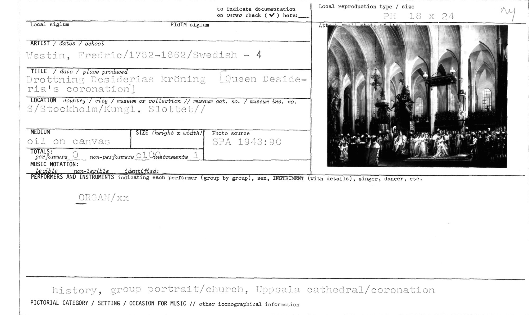 //// h-Tstory, group portrait/church, Uppsala cathedral/coronation //// PICTORIAL CATEGORY / SETTING / OCCASION FOR MUSIC // other iconographical information //// LQueen De7ie- //// TITLE / date / place prodWced //// Drottning Desiderias kröning ria's coronation-] //// to indicate documentation //// on verso check (V') heres___ //// Local siglum RIdIM siglum //// ARTIST / dater / school //// Uestin, Fredric/1732-1362/Swedish - 4 //// LOCATION country] city / museum or collection // museum cat. no. / museum inv. no. //// S/Stockholm/Kungl. Slottet// //// SIZE (height x toldth) //// TOTALS: //// perförmers Unon-performers CVD4truments 1 //// MUSIC NOTATION: //// learib/e non-leaibie identified; //// PERFORMERS AND INSTRUMENTS indicating each performer (group by group), sex, INSTRUMENT (with details), singer, dancer, etc. //// ORGATI/xx //// 0111/.10- //// MEDIUM //// oil on canvas //// Photo source //// SPA 1943:90 //// Local reproduction type / size //// Pi 13 x 24 //// At ////