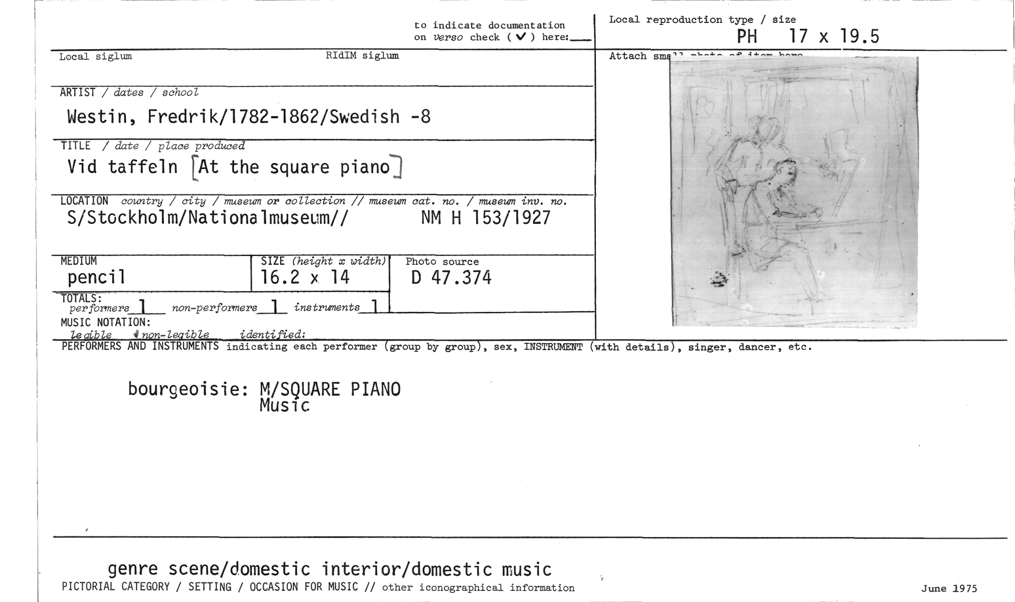 //// to indicate documentation //// on verso check (V ) here:_ //// Local reproduction type / size //// PH 17 x 19.5 //// Local siglum RIdIM siglum //// ARTIST / dates / school //// Westin, Fredrik/1782-1862/Swedish -8 //// TITLE / date / place produced //// Vid taffeln rAt the square piano //// LOCATION country / city / museum or collection // museum cat. no. / museum inv. no. //// S/Stockholm/Nationalmuseum// NM H 153/1927 //// Attach sm //// MEDIUM //// pencil //// SIZE (height x width) //// 16.2 x 14 //// Photo source //// D 47.374 //// TOTALS: //// perfolners__1___ non-performers___1_ instruments 1 //// MUSIC NOTATION: //// 4 non-lecible identified: //// PERFORMERS AND INSTRUMENTS indicating each performer (group by group), sex, INSTRUMENT (with details , singer, dancer, etc. //// bourgeoisie: M/SQUARE PIANO //// Music //// genre scene/domestic interior/domestic music //// PICTORIAL CATEGORY / SETTING / OCCASION FOR MUSIC // other iconographical information June 1975 ////
