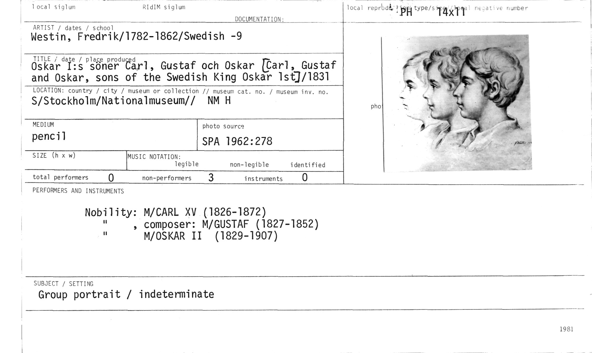 //// local repr6419pItype/siThlretal negative number //// DOCUMENTATION: //// ARTIST / dates / school //// Westin, Fredrik/1782-1862/Swedish -9 //// TITLE / date / place produced //// Oskar I:s soner Carl, Gustaf och Oskar Carl, Gustaf and Oskar, sons of the Swedish King Oskar ls-0/1831 //// LOCATION: country / city / museum or collection // museum cat. no. / museum inv. no. //// S/Stockholm/Nati onalmuseum// NM H //// MEDIUM photo source //// pencil SPA 1962:278 //// SIZE (h x w) MUSIC NOTATION: non-legible identified //// legible //// total performers 0 non-parformers 3 instruments 0 //// PERFORMERS AND INSTRUMENTS //// Nobility: M/CARL XV (1826-1872) //// " , composer: M/GUSTAF (1827-1852) //// M/OSKAR II (1829-1907) //// pho //// 1 ocal siglum RIdIM siglum //// SUBJECT / SETTING //// Group portrait / indeterminate //// 1981 ////