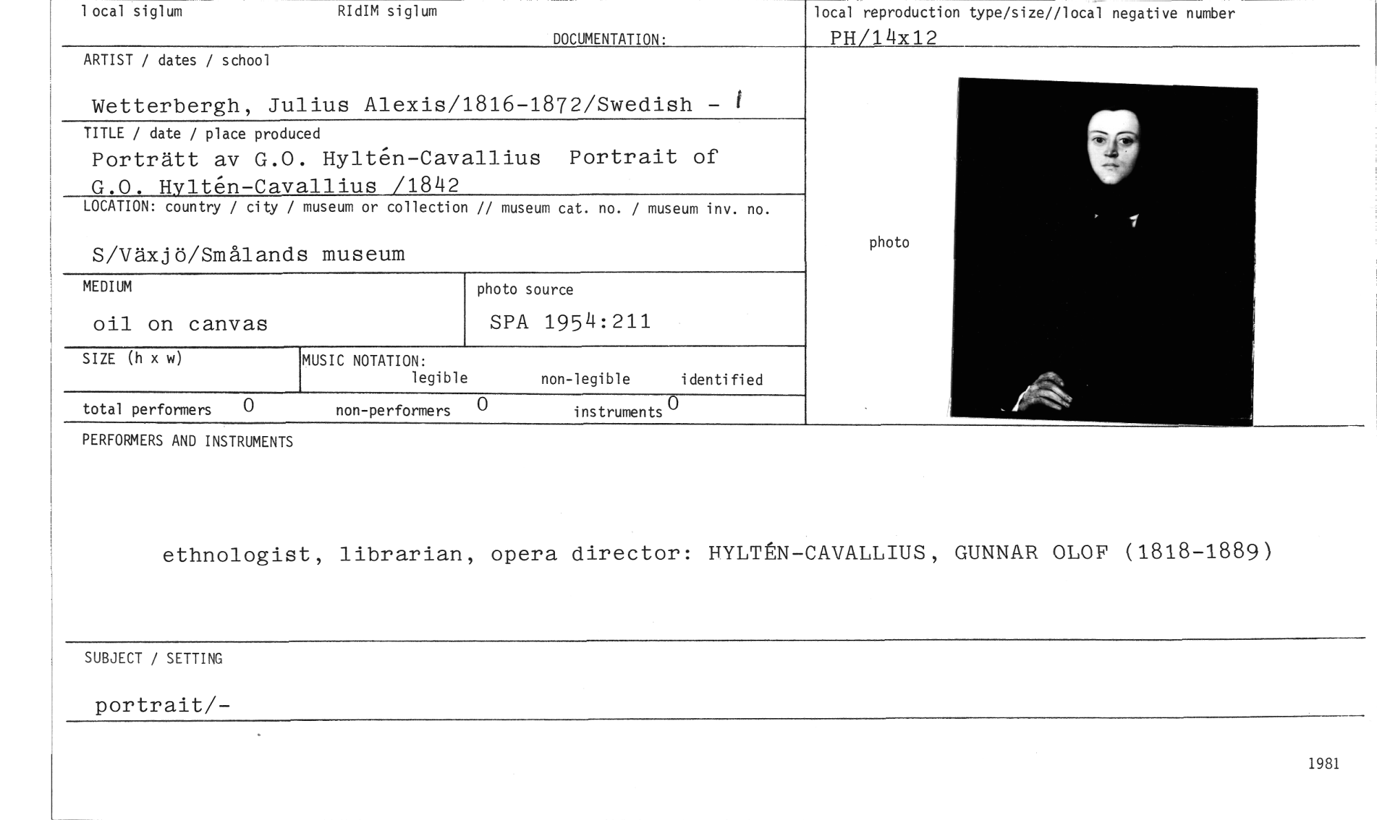 //// 1981 //// MUSIC NOTATION: //// legible //// non-legible i denti fi ed //// 0 non-performers 0 instruments° //// total performers //// photo //// 1 ocal siglum RI dIM siglum //// DOCUMENTATION: //// ARTIST / dates / school //// Wetterbergh, Julius Alexis/1816-1872/Swedish — I //// TITLE / date / place produced //// Porträtt av G.O. Hylten-Cavallius Portrait of G.O. Hulten-Cavallius /1842 //// LOCATION: country / city / museum or collection // museum cat. no. / museum inv. no. //// S/Växjö/Smålands museum //// photo source //// SPA 1954:211 //// SIZE (h x w) //// PERFORMERS AND INSTRUMENTS //// ethnologist, librarian, opera director: ITYLT2N-CAVALLIUS, GUNNAR OLOF (1818-1889) //// SUBJECT / SETTING //// portrait/- //// local reproduction type/size//local negative number //// PH/14x12 //// MEDIUM //// oil on canvas ////