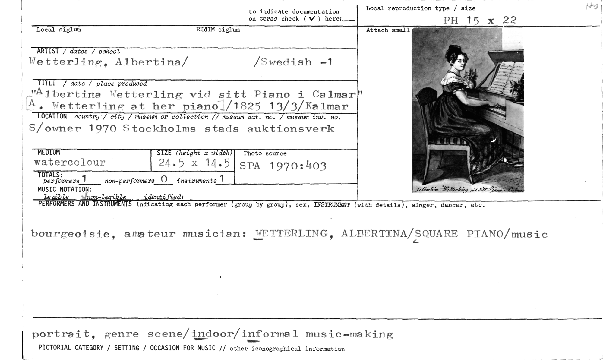 //// to indicate documentation Local reproduction type / size //// on versa check ( ) here:_ PH 15 x 22 //// Local siglum RIdIM siglum //// ARTIST / dates / school //// Wetterling, Albertina/ /Swedish -1 //// TITLE / date / place produced //// rrAlbertina 'tTetterling vid sitt Piano i Calmar //// rA //// Wetterling at her piano71825 13/3/Kalmar //// LOCATION country / city / museum or collection // museum cat. no. / museum inv. no. //// S/owner 1970 Stockholms stads auktionsverk //// MUSIC NOTATION: //// 74c:ib/e .non-leaible identified: //// PERFORMERS AND INSTRUMENTS indicating each performer (group by group), sex, INSTRUMENT //// bourgeoisie, ana teur musician: wETTERLING 9 ALBERTINA/SQUARE PIANO/music //// MEDIUM //// watercolour //// SIZE (height x width) //// 24.5 x 14,5 //// per formers I non-performers 0 instruments 1 //// Photo source //// SPÅ 1970:403 //// Attach small //// (with details), singer, dancer, etc. //// portrait, genre scene/indoor/informal music-making //// PICTORIAL CATEGORY / SETTING / OCCASION FOR MUSIC // other iconographical information ////