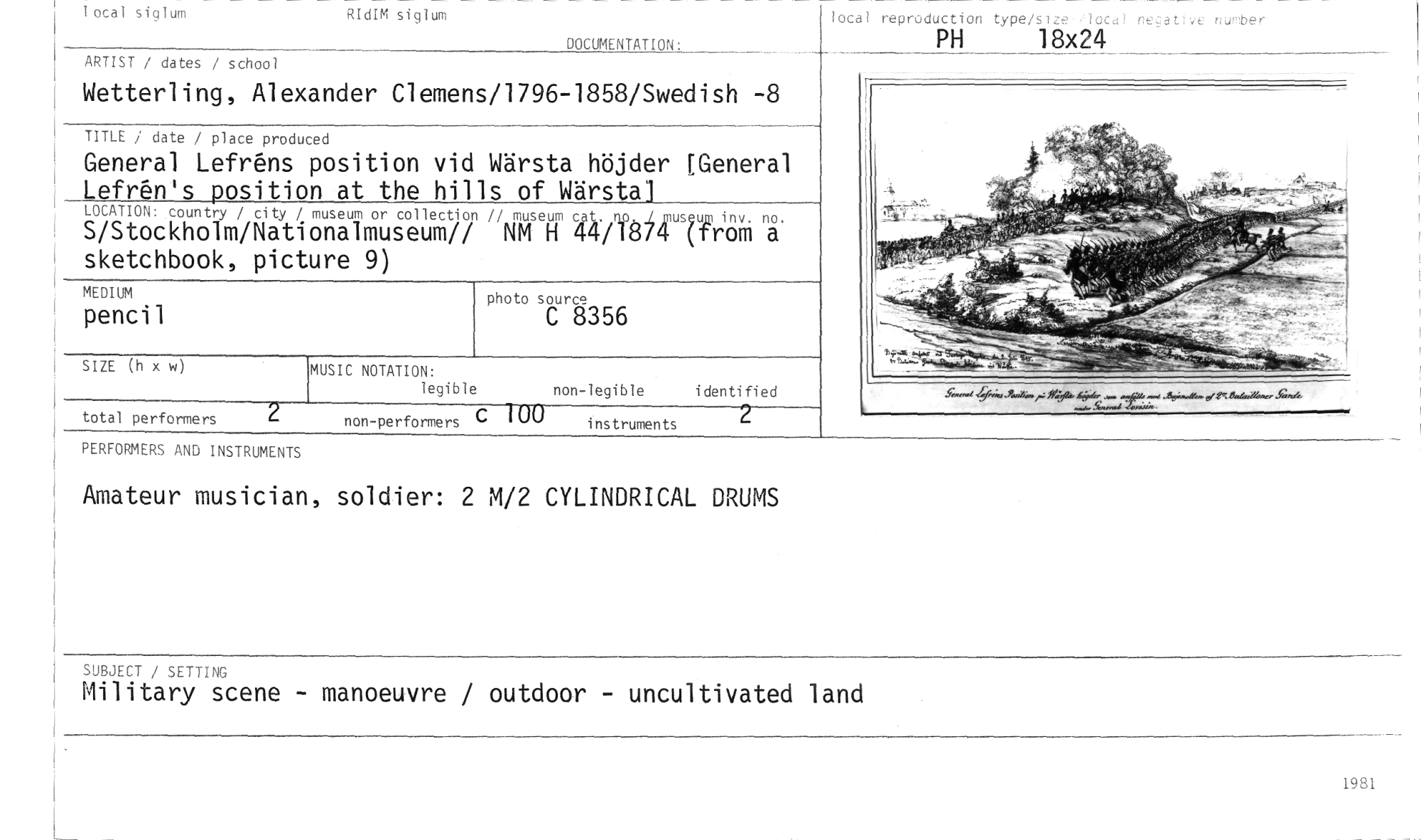 //// lotal siglum RIdIM siglum //// DOCUMENTATION: //// ARTIST / dates / school //// Wetterling, Alexander Clemens/1796-1858/Swedish -8 //// TITLE / date / place produced //// General Lefråls position vid Wärsta höjder [General //// LefrU's position at the hills of Wärsta] //// LOCATION: country / city / museum or collection // museum cat. o.uSeum inv. no. //// S/Stockholm/Nationalmuseum// NM H 44/1874 (from a sketchbook, picture 9) //// MEDIUM //// pencil //// SIZE (h x w) //// total performers //// lotal reproduction type/size local nty.J.et nurter //// PH 18x24 //// MUSIC NOTATION: //// legible non-legible identified //// non-performers C ram instruments 2 //// photo source //// C 8356 //// PERFORMERS AND INSTRUMENTS //// Amateur musician, soldier: 2 M/2 CYLINDRICAL DRUMS //// SUBJECT / SETTING //// Military scene - manoeuvre / outdoor - uncultivated land //// 1981 ////