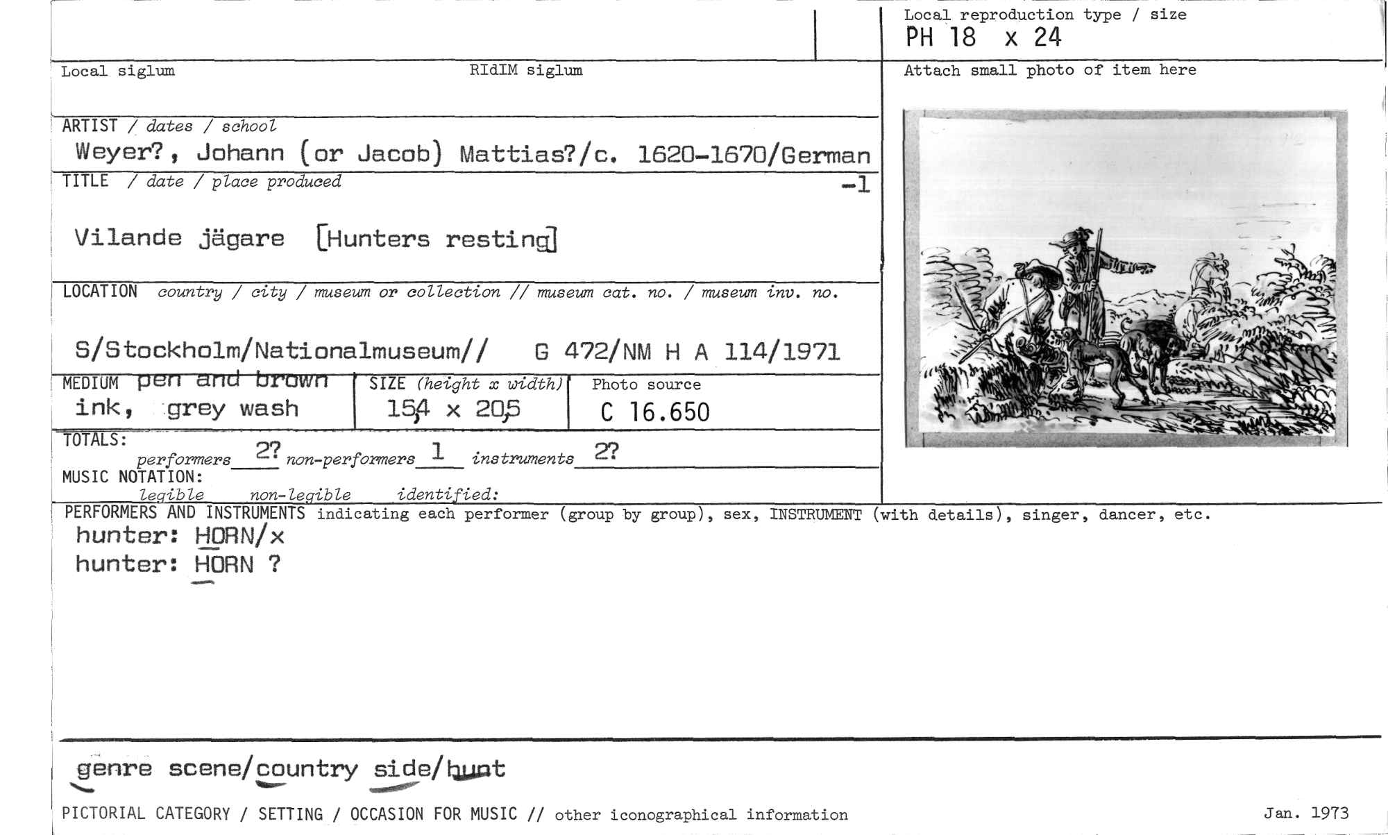 //// ARTIST / dates / school //// Weyer?, Johann (or Jacob) Mattias?/c. 1620-1670/German //// TITLE / date / place produced //// Vilande jägare [Hunters restin //// LOCATION country / city / museum or collection // museum cat. no. / museum inv. no. //// S/Stockholm/Nationalmuseum// G 472/NM H A 114/1971 MEDIUM pen elrad brown ink, grey wash //// TOT LS: //// performers non-performers 1 instruments 2? //// MUSIC NOTATION: //// legible non-legible identified: //// PERFORMERS AND INSTRUMENTS indicating each performer (group by group), sex, //// hunter: HORN/x hunter: HORN ? //// INSTRUMENT (with details), singer, dancer, etc. //// genre scene/country sidehmat //// PICTORIAL CATEGORY / SETTING / OCCASION FOR MUSIC // other iconographical information //// Jan. 1973 //// Local reproduction type / size //// PH 18 x 24 //// Local siglum RIdIM siglum //// Attach small photo of item here ////