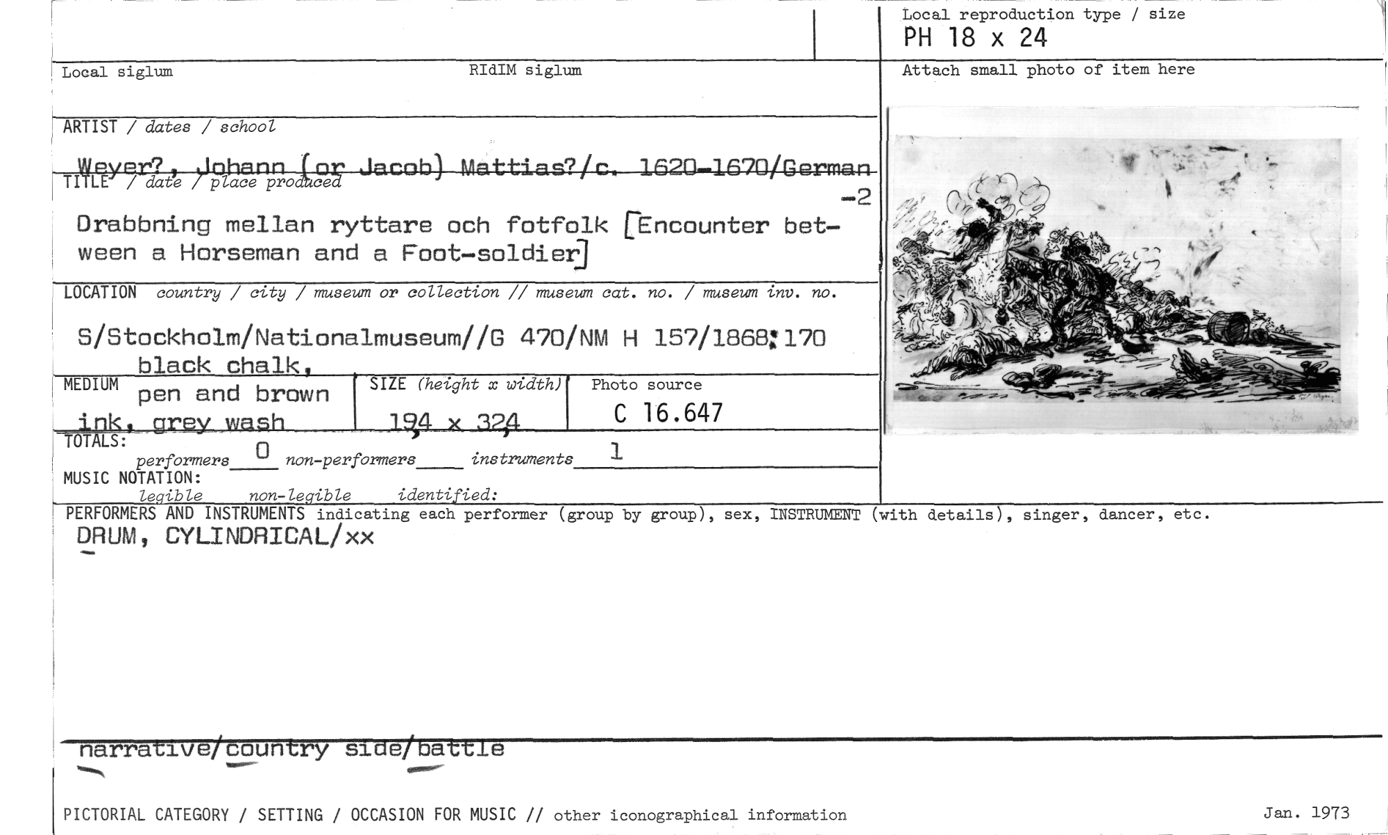 //// Local reproduction type / size //// PH 18 x 24 //// Attach small photo of item here //// Local siglum RIdIM siglum //// ARTIST / dates / school //// - Pr?, kInhann finr Jacob) Mattias?/c, 1620-1670/German //// 14AifttY/ date / place prodzced //// —2 //// Drabbning mellan ryttare och fotfolk ['Encounter between a Horseman and a Foot—soldierJ //// , LOCATION country / city / museum or collection // museum cat. no. / museum inv. no. //// TOTALS: //// instruments //// S/Stockholm/Nationalmuseum//G 470/NM H 157/1868:170 black chalk, //// MEDIUM pen and brown SIZE (height x width) Photo source //// performers //// MUSIC NOTATION: //// leqible non-leaible identified: //// non -performers //// C 16.647 1 //// PERFORMERS AND INSTRUMENTS indicating each performer (group by group), sex, INSTRUMENT (with details), singer, dancer, etc. //// DRUM, CYLINDRICAL/xx //// narrative/ country side battie //// ese~- //// PICTORIAL CATEGORY / SETTING / OCCASION FOR MUSIC // other iconographical information //// Jan. 1973 ////