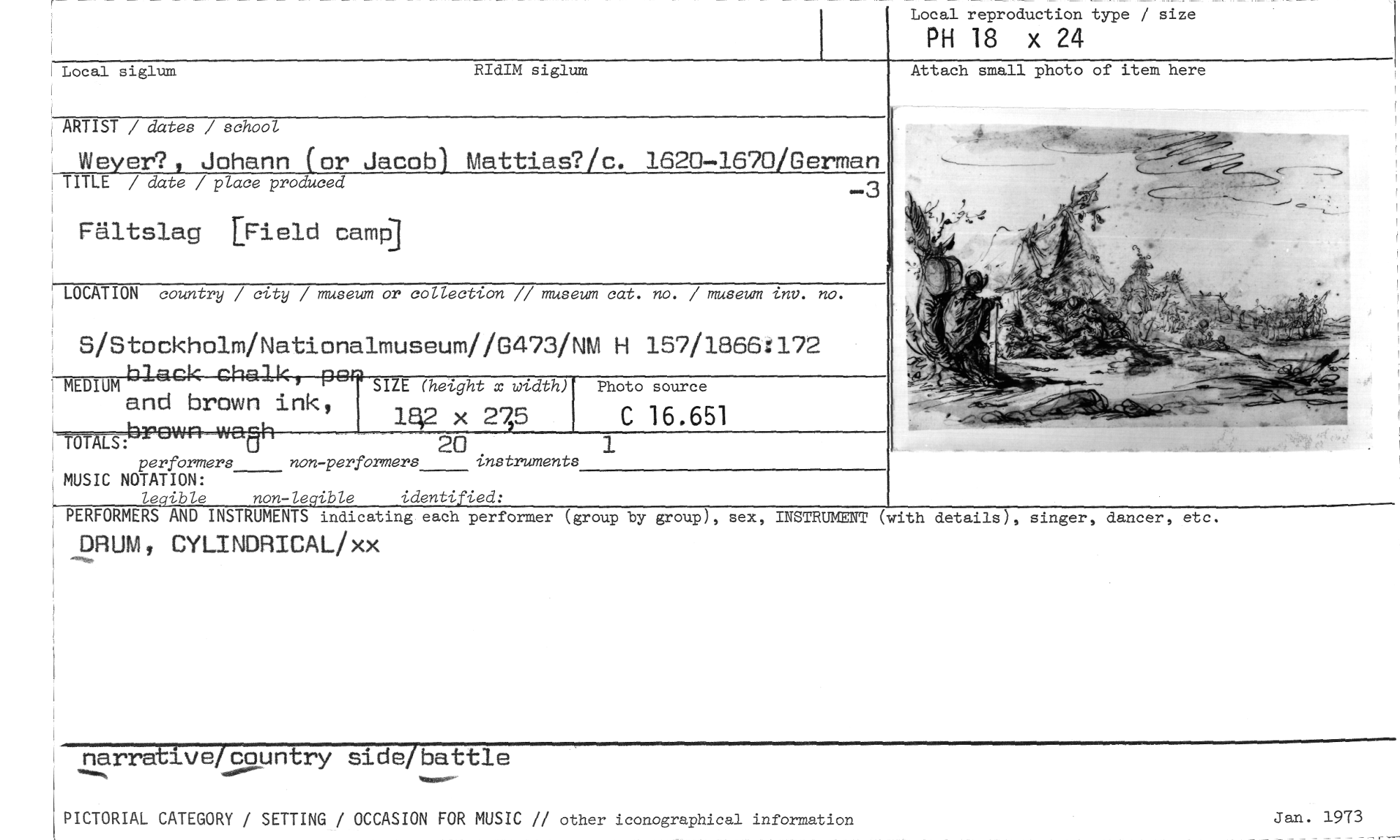 //// Local reproduction type / size //// PH 18 x 24 //// Attach small photo of item here //// Local siglum RIdIM siglum //// ARTIST / dates / school //// Weyer?, Johann (or Jacob) Mattias?/c. 1620-1670/German //// TITLE / date / place produced —3 //// Fältslag [Field camp] //// LOCATION country / city / museum or collection // museum cat. no. / museum inv. no. //// S/Stockholm/Nationalmuseum//G473/NM H 157/1866:172 MEDIUMblack chalk, po //// SIZE (height x width) Photo source //// and brown ink, //// 1Q2 x 27,5 C 16.651 //// -- //// TOTALS:brown U -wah 20 1 //// performers non-performers instruments //// MUSIC NOTATION: //// legible non-legible identified: //// PERFORMERS AND INSTRUMENTS indicating each performer (group by //// DRUM, CYLINDRICAL/xx //// group), sex, INSTRUMENT (with details), singer, dancer, etc. //// narrative/country side/battle //// ^aram..- //// PICTORIAL CATEGORY / SETTING / OCCASION FOR MUSIC // other iconographical information //// Jan. 1973 ////
