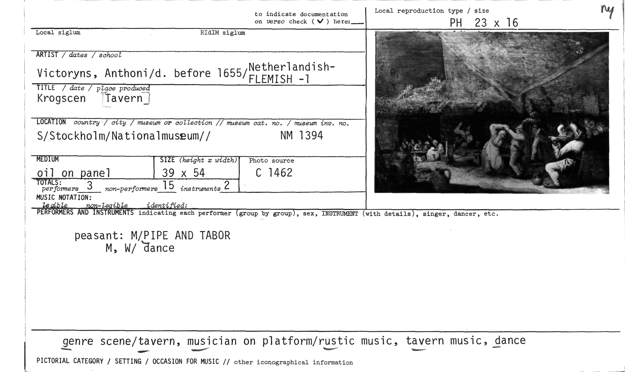 //// to indicate documentation //// on Verso check (V ) here:_ //// Local reproduction type / size //// PH 23 x 16 //// (with //// details), singer, dancer, etc. //// Local siglum RIdIM siglum //// ARTIST / dates / school //// Victoryns, Anthoni/d. before 1655/Netherlandish- //// FLEMISH -1 //// TITLE / date / pZace produced //// Krogscen 4avernj //// LOCATION country / city / museum or collection // museum cat. no. / museum tnv. no. //// S/Stockholm/Nationalmuseumn NM 1394 //// MEDIUM SIZE (height x width) //// _pil on panel 39 x 54 //// TOT IS: //// per formers 3 non-perfbrmers 15 instruments 2 //// MUSIC NOTATION: //// le ble non-leaible iblentified; //// PERFORMERS AND INSTRUMENTS indicating each performer (group by group), sex, INSTRUMENT //// peasant: M/PIPE AND TABOR M, W/'aance //// Photo source //// C 1462 //// genre scene/tavern, musician on platform/rustic music, tavern music, dance //// M111.^ //// PICTORIAL CATEGORY / SETTING / OCCASION FOR MUSIC // other iconographical information ////