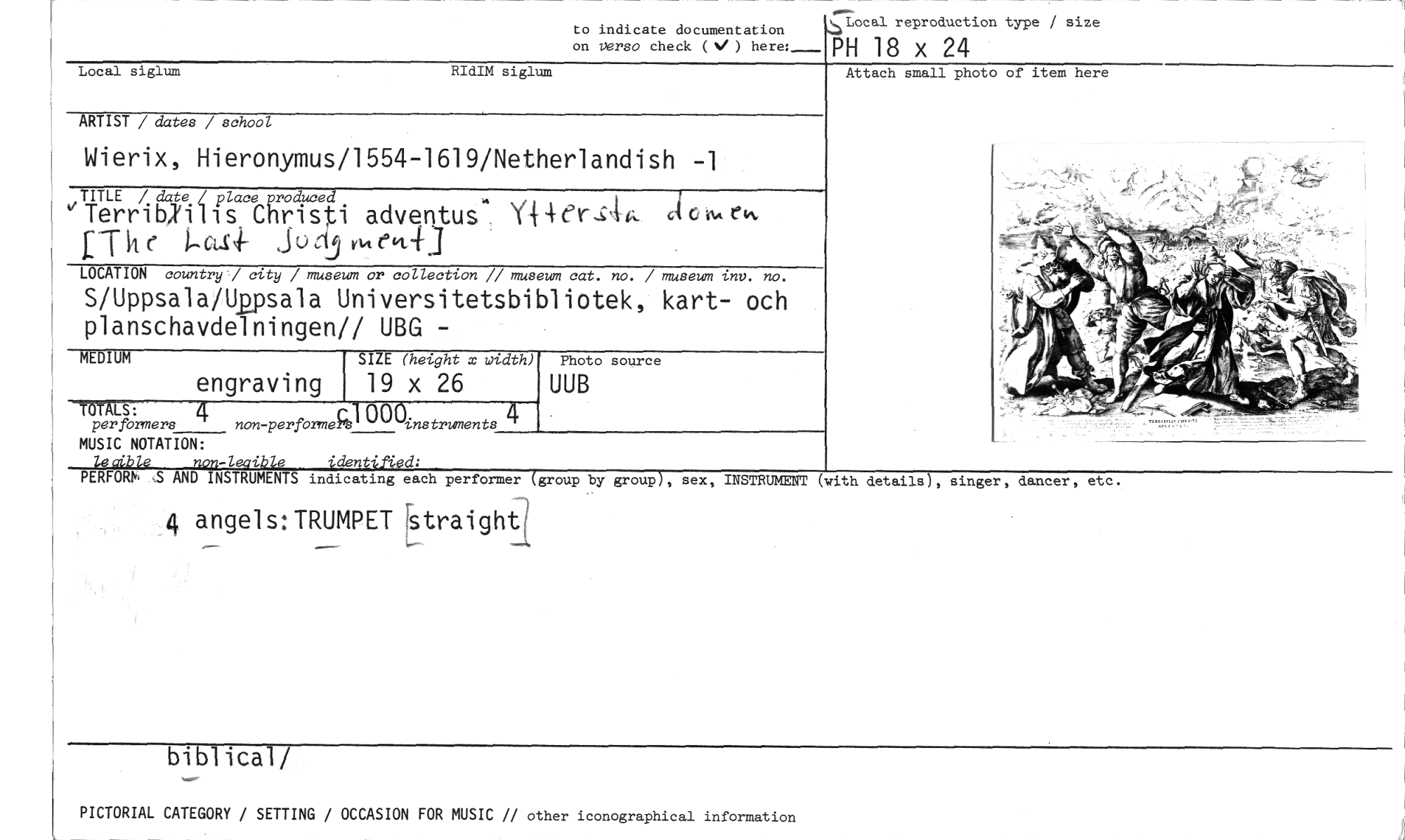 //// to indicate documentation //// on versa check (%/) here:— //// Local reproduction type / size //// PH 18 x 24 //// Attach small photo of item here //// Local siglum //// RIdIM siglum //// ARTIST / dates / school //// Wierix, Hieronymus/1554-1619/Netherlandish -1 //// TITLE / date placeproduced //// Christi adventus Y4-4er-åc, LTkr ,jo 19 g., en-f3 //// LOCATION country / city / museum or collection // museum cat. no. / museum inv. no. //// S/Uppsala/U2psala Universitetsbibliotek, kart- och planschavdelningen// UBG - //// MEDIUM SIZE (height x width) //// engraving 19 x 26 Photo source //// UUB //// per formers non-perfbrmeg 00 instruments //// ,LS: //// MUSIC NOTATION: //// lecible non-leaible identifYed: //// PERFORM ,S AND INSTRUMENTS indicating each performer (group by group), sex, INSTRUMENT (with //// 4 angels: TRUMPET 6traight( //// details), singer, dancer, etc. //// biblical/ //// PICTORIAL CATEGORY / SETTING / OCCASION FOR MUSIC // other iconographical information ////