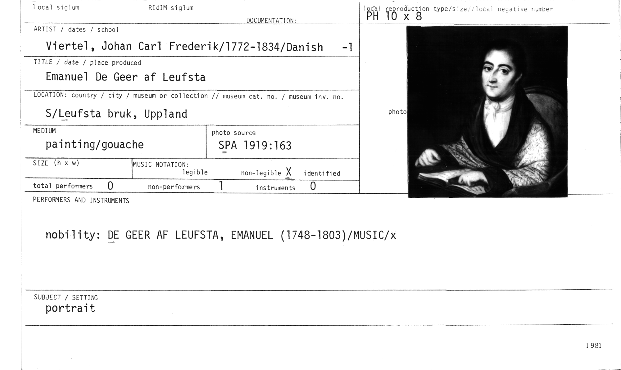 //// PERFORMERS AND INSTRUMENTS //// nobility: DE GEER AF LEUFSTA, EMANUEL (1748-1803)/MUSIC/x //// instruments 0 //// 0 //// total performers //// non-performers //// lotal siglum RIdIM siglum //// DOCUMENTATION: //// local reproduction type/size local !lega e nurober //// PH 10 x 8 //// ARTIST / dates / school //// Viertel, Johan Carl Frederik/1772-1834/Danish //// TITLE / date / place produced //// Emanuel De Geer af Leufsta //// LOCATION: country / city / museum or collection // museum cat. no. / museum inv. no. //// S/Leufsta bruk, Uppland //// photo source //// SPA 1919:163 //// SIZE (h x w) //// MEDIUM //// painting/gouache //// MUSIC NOTATION: //// legible non-legible X identified //// photo //// SUBJECT / SETTING //// portrait //// 1 981 ////