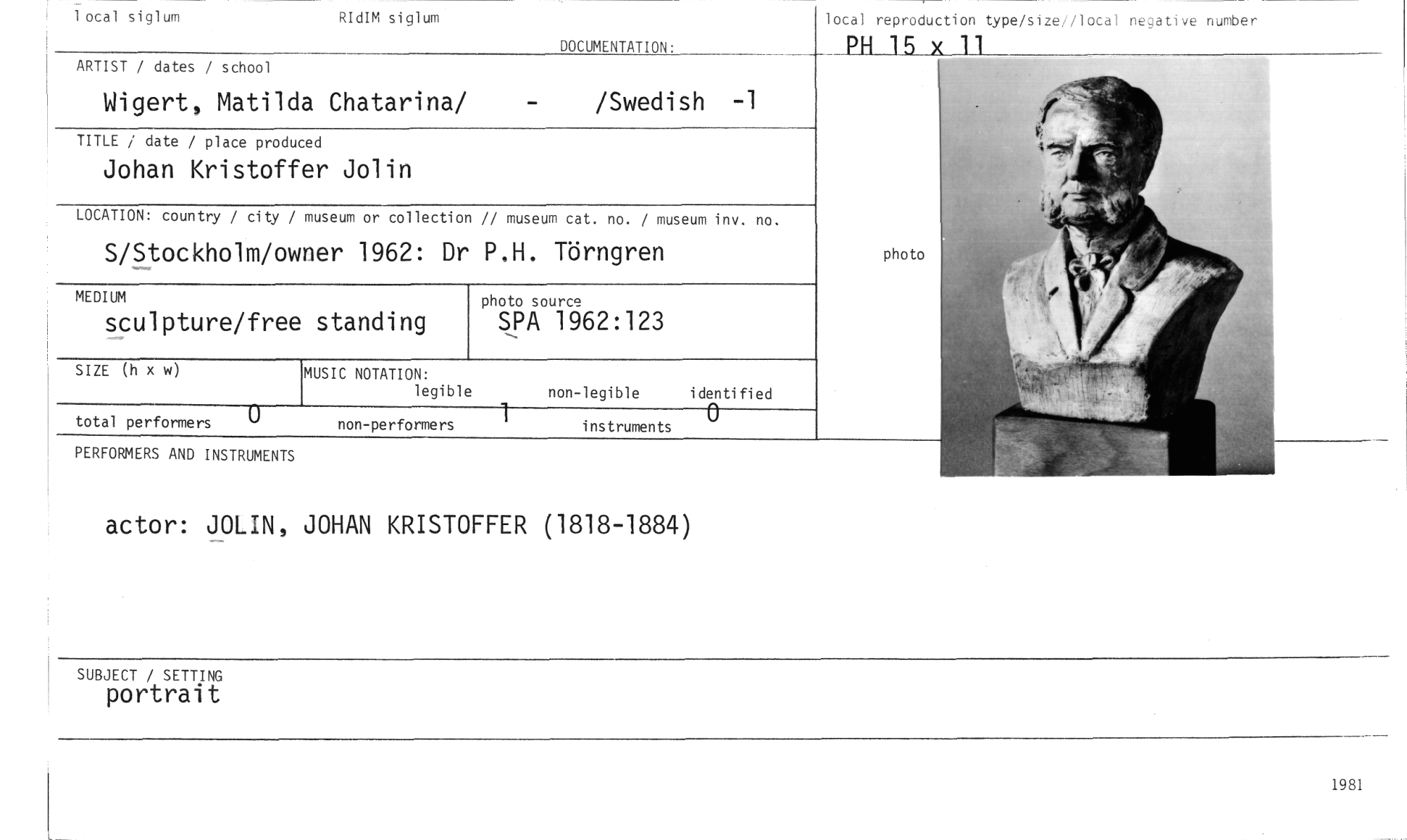 //// /Swedish -1 //// Wigert, Matilda Chatarina/ //// non-performers instruments //// total performers //// 1 ocal siglum //// RIdIM siglum //// DOCUMENTATION: //// ARTIST / dates / school //// TITLE / date / place produced //// Johan Kristoffer Jolin //// LOCATION: country / city / museum or collection // museum cat. no. / museum inv. no. //// S/Stockholm/owner 1962: Dr P.H. Törngren //// photo source //// SPA 1962:123 //// SIZE (h x w) //// PERFORMERS AND INSTRUMENTS //// actor: JOLIN, JOHAN KRISTOFFER (1818-1884) //// MEDIUM //// sculpture/free standing //// MUSIC NOTATION: //// legible //// non-legible identified //// 0 //// SUBJECT / SETTING //// portrait //// 1981 //// lotal reproduction type/sizei/local neuative number //// PH 15 x 11 ////