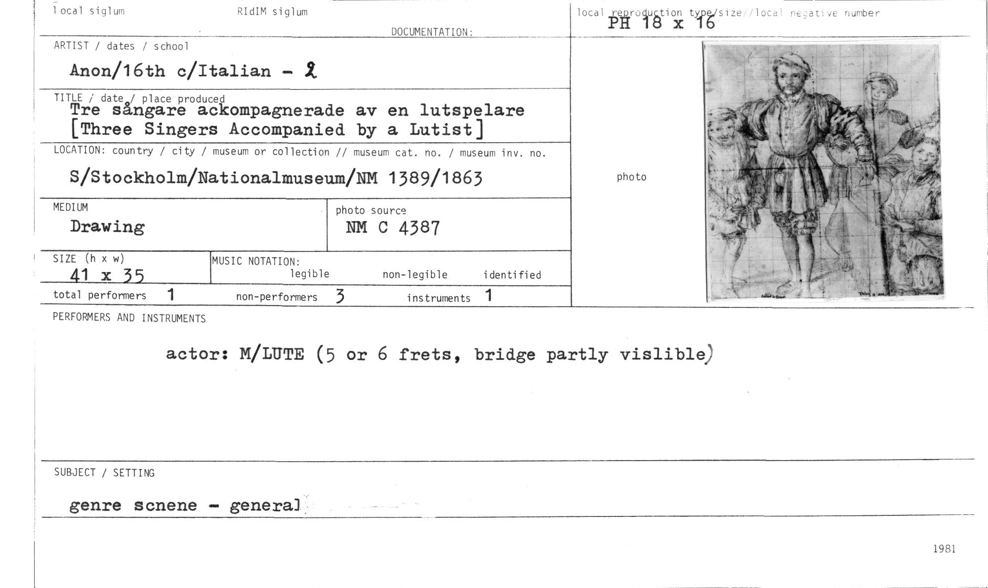 //// 1981 //// non-kgiMe identified //// MUSIC NOTATION: //// legible //// local siglum RldIM siglum //// DOCUMENTATION: //// ARTIST / dates / school //// Anon/16th c/Italian — //// TITLE / date / place produced //// Tre sångare ackompagnerade av en lutspelare [Three Singers Accompanied by a Lutist] //// LOCATION: country / city / museum or collection // museum cat. no. / museum inv. no. //// S/Stockholm/Nationalmuseum/NM 1389/1863 //// MEDIUM //// Drawing //// non-performers 3 instruments 1 //// SIZE (h x w) //// 41 x 35 //// total performers 1 //// photo source //// NM C 4387 //// photo //// PERFORMERS AND INSTRUMENTS //// actor: M/LUTE (5 or 6 frets, bridge partly vislible) //// SUBJECT / SETTING //// genre scnene — genera], //// localissyogpWon typtize//local number //// la 2C ////