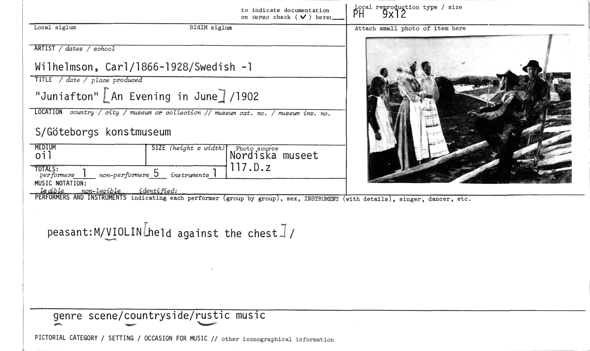 //// to indicate documentation gal reuy //// on verso check (,1 ) here:- ron type / size //// ARTIST / dates / school //// Wilhelmson, Car1/1866-1928/Swedish -1 //// TITLE / date / place produced //// "Juniafton" EM Evening in June:1/1902 //// LOCATION country,/ city / museum or collection // museum cat. no. / museum inv. no. //// S/Göteborgs konstmuseum //// MEDIUM //// Ou 1 SIZE (height x width) Nordiska museet //// Photo source //// 117.D.z //// TOTALS: //// per formers 1 non-perförmers 5 instruments 1 //// MUSIC NOTATION: //// _kpAble non -leorible identified: //// PE FORMERS AND INSTRUMENTS indicating each performer (group by group), sex, INSTRUMENT (with details), singer, dancer, etc. //// peasant:M/VIOLINLheld against the chest:I/ //// genre scene/countryside/rustic music //// PICTORIAL CATEGORY / SETTING / OCCASION FOR MUSIC // other iconographical information //// 4 ////