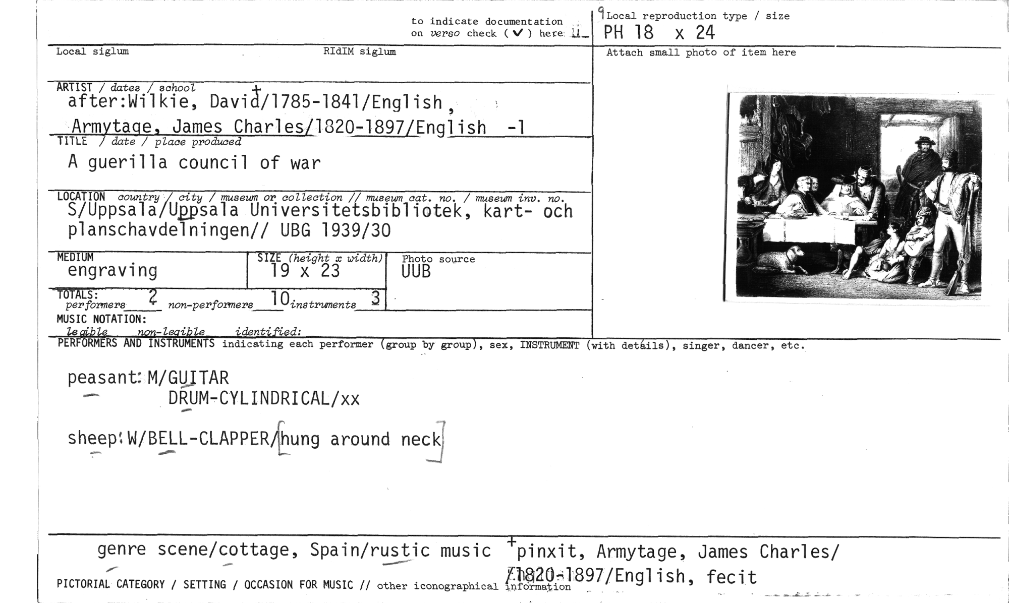 //// to indicate documentation //// on vers° check (%, ) here 11... //// 9 Local reproduction type / size //// PH 18 x 24 //// Attach small photo of item here //// ARTIST / dates / school //// after:Wilkie, DaviA/1785-1841/English, Armetage, James Charles/1820-1897/English //// TITLE / date / place produced //// A guerilla council of war //// LOCATION country" city / museum or collection // museum cat. no. / museum inv. no. //// S/Uppsala/Uppsala Universitetsbibliotek, kart- och planschavdelningen// UBG 1939/30 //// ark source //// 737177-2 //// per formers non-perfbrmers 1 ()instruments //// MUSIC NOTATION: //// lecibls non-leaible identified: //// PERFORMERS AND INSTRUMENTS indicating each performer (group by group), //// peasant:M/GIAJTAR //// DRUM-CYLINDRICAL/xx //// sheeptW/BELL-CLAPPER/hung around veck) //// MEDIUM //// engraving //// SIZE (height x width) //// 19 x 23 //// dancer, etc. //// sex, INSTRUMENT (with details), singer, //// Local siglum //// RIdIM siglum //// genre scene/cottage, Spain/rustic music 4-pinxit, Armytage, James Charles/ //// flIB204897/English, fecit //// PICTORIAL CATEGORY / SETTING / OCCASION FOR MUSIC // other iconographical information ////