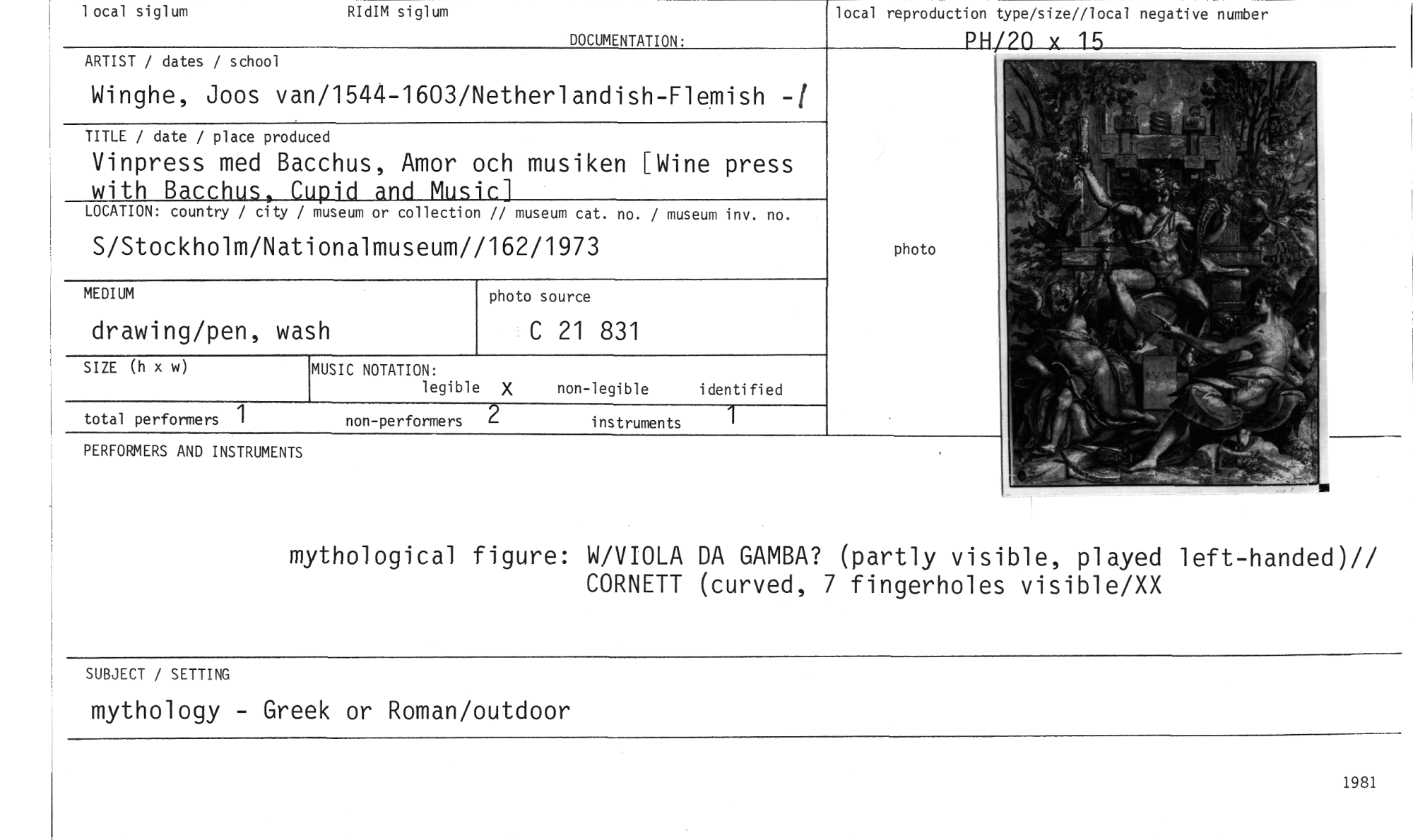 //// mythology - Greek or Roman/outdoor //// 1981 //// total performers 1 //// non-performers 2 instruments 1 //// local siglum RIdIM siglum //// DOCUMENTATION: //// ARTIST / dates / school //// Winghe, Joos van/1544-1603/Netherlandish-Flemish - //// TITLE / date / place produced //// Vinpress med Bacchus, Amor och musiken Nine press //// with Bacchus, Gnid and Music] //// LOCATION: country / city / museum or collection // museum cat. no. / museum inv. no. //// S/Stockholm/Nationalmuseum//162/1973 //// MEDIUM //// drawing/pen, wash //// SIZE (h x w) //// PERFORMERS AND INSTRUMENTS //// MUSIC NOTATION: //// legible X non-legible identified //// photo source //// C 21 831 //// photo //// mythological figure: W/VIOLA DA GAMBA? (partly visible, played left-handed)// CORNETT (curved, 7 fingerholes visible/XX //// SUBJECT / SETTING //// local reproduction type/size//local negative number //// PH/20 x_ 15 ////