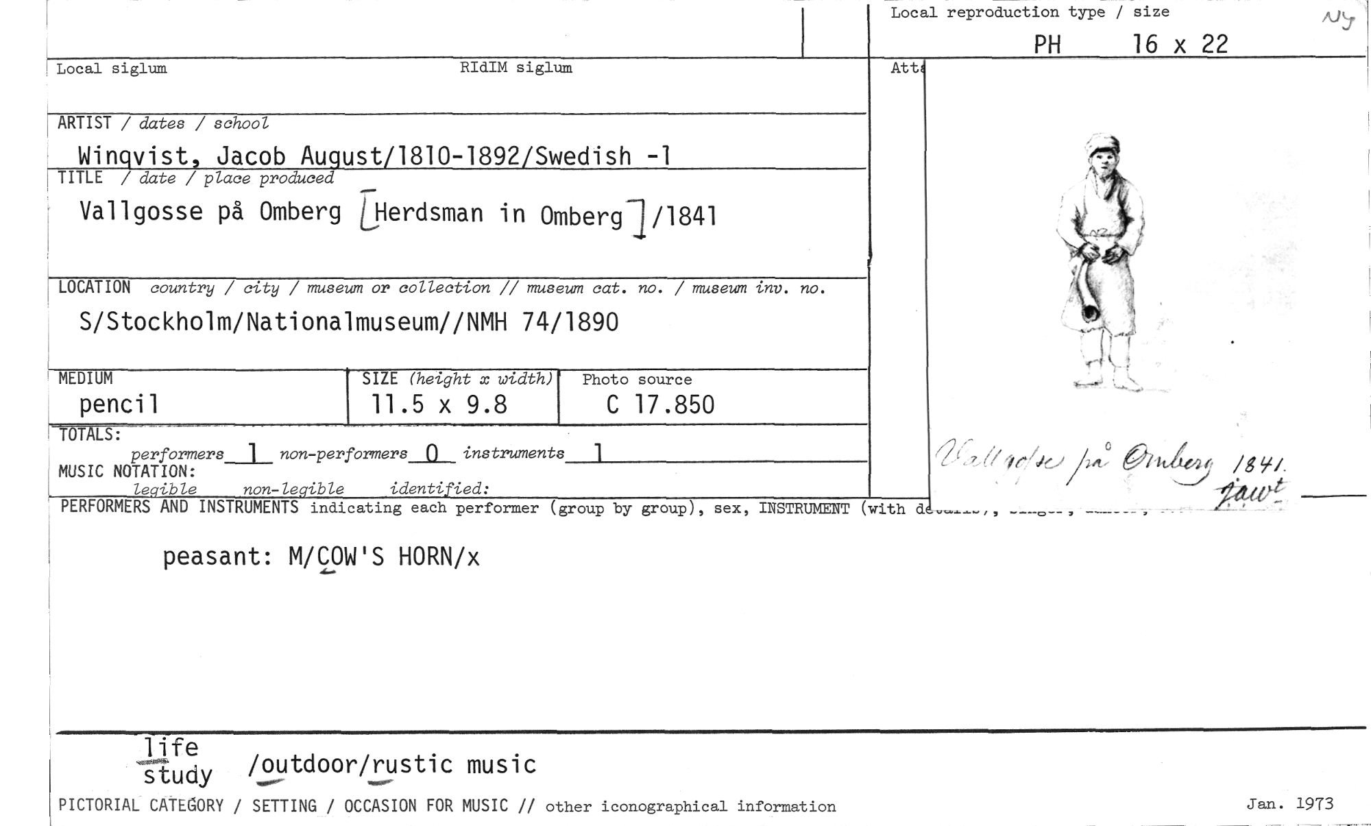 //// Local reproduction type / size //// PH 16 x 22 //// //// Local siglum RIdIM siglum Att //// ARTIST / dates / school //// Winqvist, Jacob August/1810-1892/Swedish -1 //// TITLE / date / place produced //// Vallgosse på Omberg LHerdsman in Omberg11/1841 //// LOCATION country / city / museum or collection // museum cat. no. / museum inv. no. //// S/Stockholm/Nationalmuseum//NMH 74/1890 //// MEDIUM Photo source //// SIZE (height x width) //// 11.5 x 9.8 //// pencil C 17.850 //// HTOTALS: //// performers_l_ non-performersjOI instruments //// MUSIC NOTATION: //// legible non-legible identified: //// PERFORMERS AND INSTRUMENTS indicating each performer (group by group), sex, INSTRUMENT (with d //// //// //// peasant: M/COW'S HORN/x //// A r 0 //// r( (.7/(//ke./1(-11.1/ 61tIte4 /89/. //// life //// study ou //// /tdoor/rustic music //// PICTORIAL CATEGORY / SETTING / OCCASION FOR MUSIC // other iconographical information //// Jan. 1973 ////