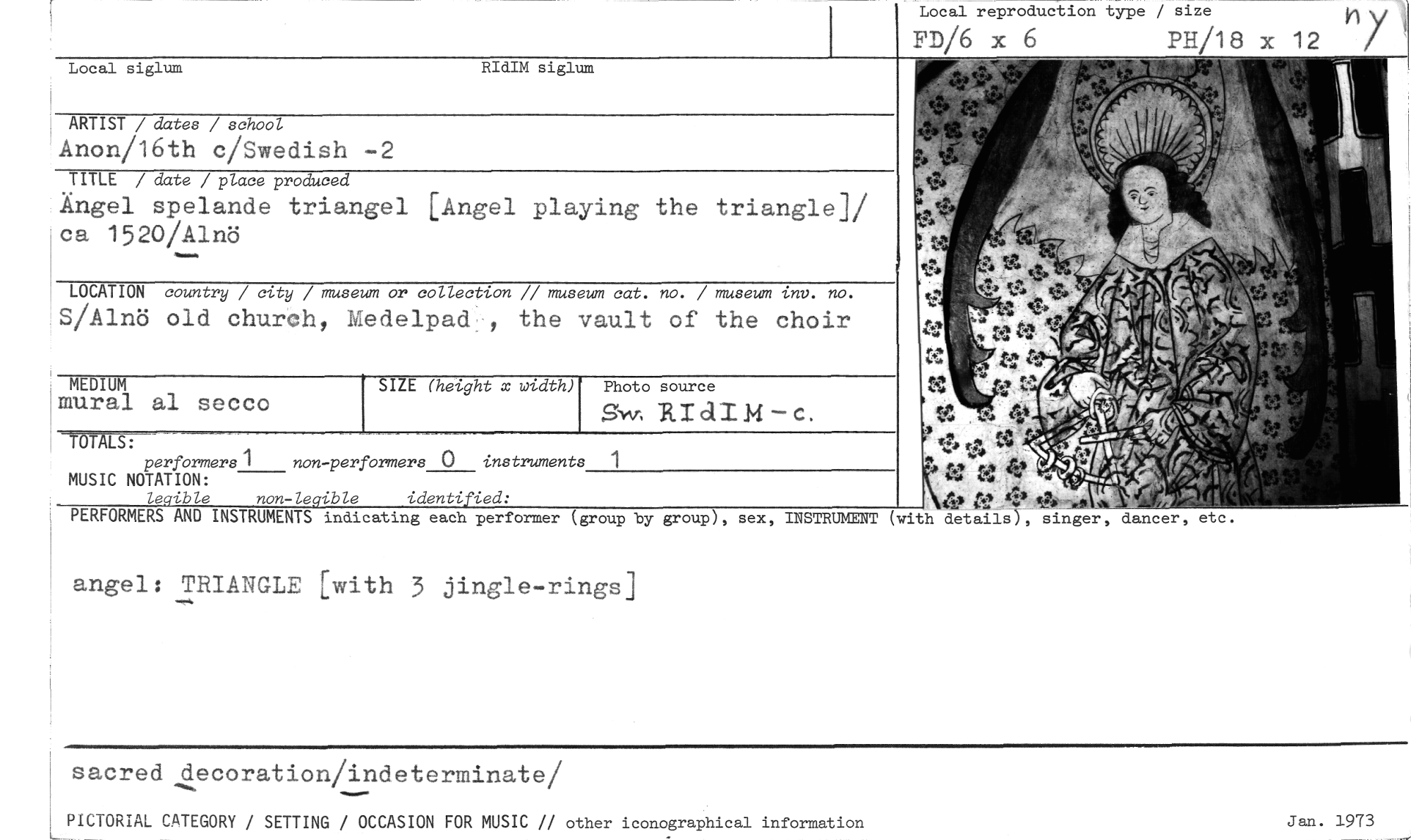 //// PICTORIAL CATEGORY / SETTING / OCCASION FOR MUSIC // other iconographical information //// Jan. 1973 //// RIdIM siglum //// Local siglum //// (group by group), sex, //// performers1 non-performers 0 instruments 1 //// MUSIC NOTATION: //// le•ible non-le ible identi ied: //// PERFORMERS AND INSTRUMENTS indicating each performer //// Local reproduction type / size //// h //// FD/6 x 6 PH/18 x 12 //// ARTIST / dates / school //// Anon/16th c/Swedish -2 //// TITLE / date / place produced //// Ängel spelande triangel [Angel playing the triangle]/ ca 1520/Alnö //// LOCATION country / city / museum or collection // museum cat. no. / museum tn.s. no. //// S/Alnö old church, Medelpad , the vault of the choir //// MEDIUM //// mural al secco //// Photo source //// .91.1A RIdIM—c. //// SIZE (height x width) //// w .4 40 //// 4 e: //// ,,, //// 4c, A? 4> //// INSTRUMENT (with details), singer, //// angel: TRIANGLE [with 3 jingle-rings] //// sacred decoration/indeterminate/ ////