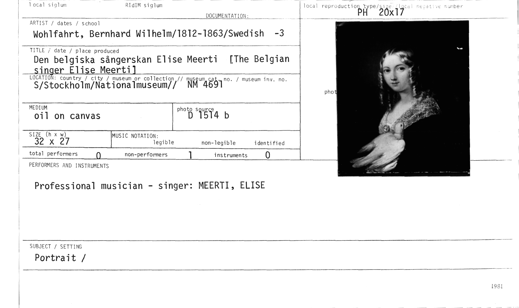 //// Professional musician - singer: MEERTI, ELISE //// SUBJECT / SETTING //// Portrait / //// ph°t13 s1 5`14 b //// MEDIUM //// oil on canvas //// 1 ocal siglum RIdIM siglum //// DOCUMENTATION: //// ARTIST / dates / school //// Wohlfahrt, Bernhard Wilhelm/1812-1863/Swedish -3 //// lotal reproduction ;type/lize, 1_2Cal nea //// Pli 20x17 //// enumber //// TITLE / date / place produced //// Den belgiska sångerskan Elise Meerti [The Belgian //// singer Elise Meertil //// LOCATION: country / city / museum or collection // museum c no. / museum inv. no. //// S/Stockholm/Nationalmuseum// NIA 4691 //// pho //// SIZE (h x w) //// 32 x 27 //// MUSIC NOTATION: //// legible //// non-legible identified //// total performers non-performers //// PERFORMERS AND INSTRUMENTS //// 1981 ////