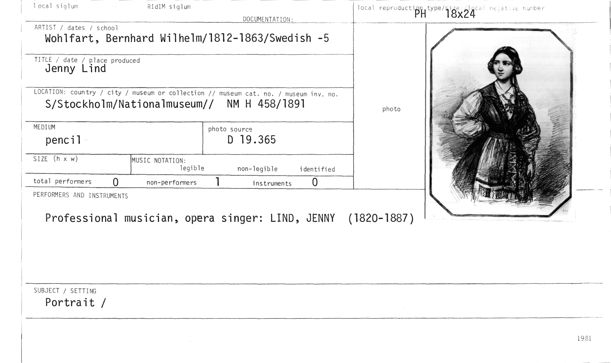 //// • //// 1 otal siglum RIdIM siglum //// lotal reproductigitype/we ve nurober //// i ULF //// DOCUMENTATION: //// ARTIST / dates / school //// Wohlfart, Bernhard Wilhelm/1812-1863/Swedish -5 //// TITLE i date / place produced //// Jenny Lind //// museum or collection // museum cat. no. / museum inv. no. //// tionalmuseum// NM H 458/1891 //// LOCATION: country / city / //// S/Stockholm/Na //// photo //// photo source //// D 19.365 //// MEDIUM //// pencil //// MUSIC NOTATION: //// legible //// SIZE (h x w) //// non-legible identified //// non-performers 1 instruments 0 //// total performers 0 //// PERFORMERS AND INSTRUMENTS //// Professional musician, opera singer: LIND, JENNY (1820-1887) //// 1981 //// SUBJECT / SETTING //// Portrait / ////