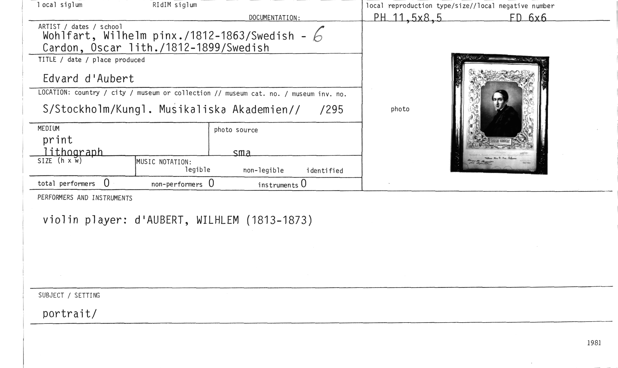//// DOCUMENTATION: //// local reproduction type/size//local negative number //// PH 11,5x8,5 FD 6x6 //// ) 1 ocal siglum RIdIM siglum //// ARTIST / dates / school //// Wohlfart, Wilhelm pinx./1812-1863/Swedish Cardon, Oscar lith./1812-1899/Swedish //// TITLE / date / place produced //// Edvard d'Aubert //// LOCATION: country / city / museum or collection // museum cat. no. / museum inv. no. //// S/Stockholm/Kungl. Musikaliska Akademien// /295 //// photo source //// sma //// MUSIC NOTATION: //// legible non-legible i denti fi ed //// MEDIUM //// print //// lithngra h //// SIZE (h x w) //// photo //// total performers non-performers 0 instruments 0 //// PERFORMERS AND INSTRUMENTS //// violin player: d'AUBERT, WILHLEM (1813-1873) //// SUBJECT / SETTING //// portrait/ //// 1981 ////