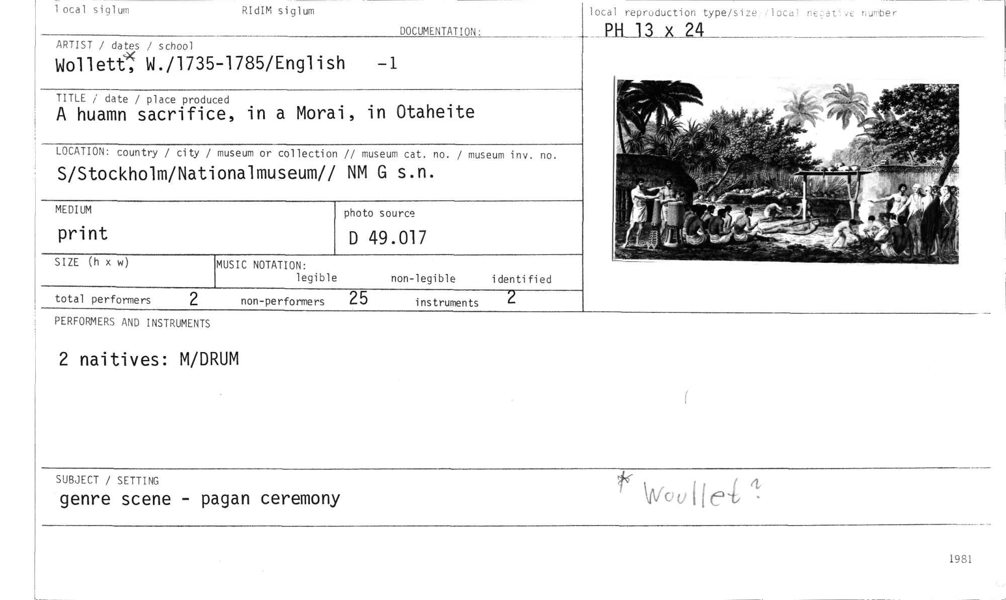 //// 1 ocal siglum RIdIM siglum //// lotal reproduction type/size lotal negative nurober //// DOCUMENTATION: //// PH 13 x 24 //// ARTIST / dates / school //// Wollete W./1735-1785/English 1785/English -1 //// TITLE / date / place produced //// A huamn sacrifice, in a Morai, in Otaheite //// LOCATION: country / city / museum or collection // museum cat. no. / museum inv. no. //// S/Stockholm/Nationalmuseum// NM G s.n. //// MEDIUM //// print //// SIZE (h x w //// photo source //// D 49.017 //// MUSIC NOTATION: //// legible non-legible identified //// total performers 2 non-performers 25 instruments 2 //// RERFORMERS AND INSTRUMENTS //// 2 naitives: M/DRUM //// SUBJECT / SETTING //// genre scene - pagan ceremony Vvou 1 i ei //// 1981 ////