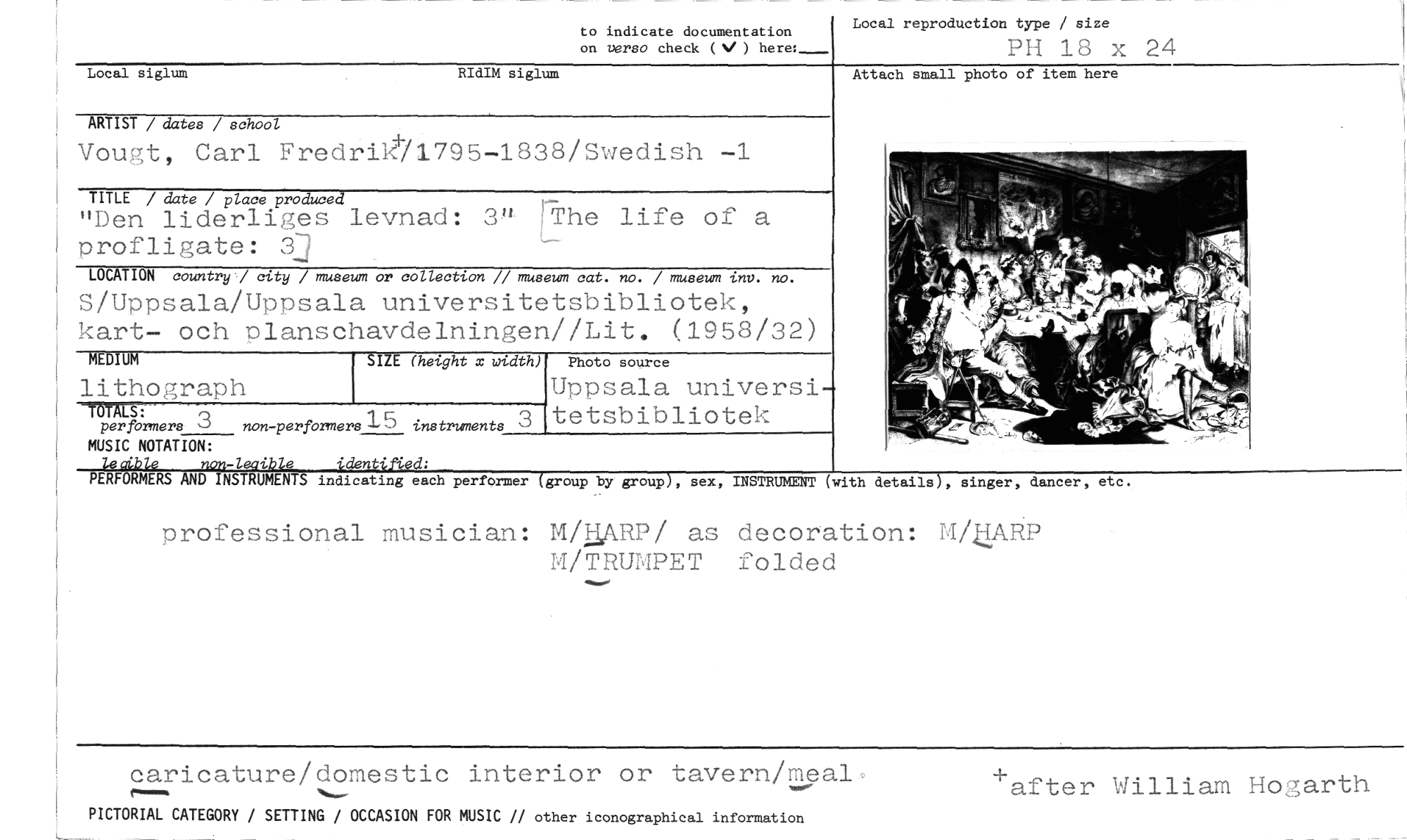 //// to indicate documentation Local reproduction type / size //// on verso check (V) here:___- PH 18 x 24 //// Local siglum RIdIM siglum //// ARTIST / dates / school //// Vougt, Carl Fredri01795-1838/Swedish -1 //// TITLE / date / place produced //// "Den liderliges levnad: 3" r-The life of a profligate: 3i //// LOCATION country / city / museum or collection // museum cat. no. / museum 2nv. no. //// S/Uppsala/Uppsala universitetsbibliotek, kart- och planschavdelningen//Lit. (1958/32) //// MEDIUM SIZE (height x width) //// lithograph //// r //// per formers sJ non-performers - instruments 3 //// MUSIC NOTATION: //// leaible non-leaible identified: //// PERFORMERS AND INSTRUMENTS indicating each performer (group by group), sex, INSTRUMENT //// professional musician: M/UARP/ as decoration: M/ZARP //// M/TRUMPET folded //// Photo source //// Uppsala universitetsbibliotek //// (with details), singer, dancer, etc. //// Attach small photo of item here //// caricature/domestic interior or tavern/meal- //// V //// PICTORIAL CATEGORY / SETTING / OCCASION FOR MUSIC // other iconographical information //// safter William Hogarth ////