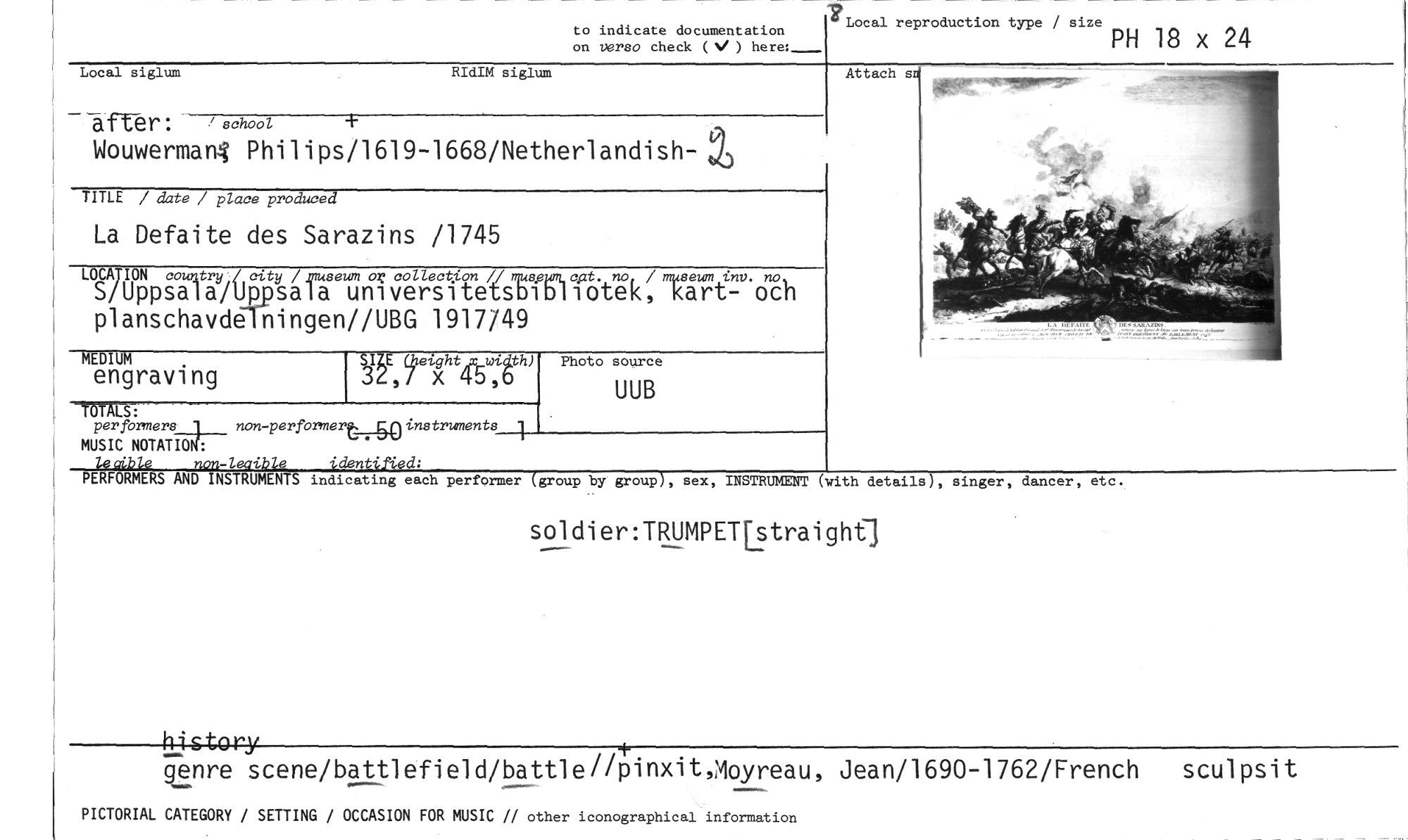 //// Local reproduction type / size //// PH 18 x 24 //// MEDIUM //// engraving //// SIE cheight,width) //// 327 x 45,6 //// Photo source //// UUB //// 1 //// TÖMS: //// per formers 1 non-perfo2tnert 50 instruments //// MUSIC NOTATION: //// le491/e non-leaible identified: //// PERFORMERS AND INSTRUMENTS indicating each performer (group by group), sex, INSTRUMENT (with details), singer, dancer, etc. //// to indicate documentation //// on versa check (V ) here:_ //// Local siglum RIdIM siglum //// äfter: /school //// Wouwerman4 Philips/1619-1668/Netherlandish- //// TITLE / date / place produced //// La Defaite des Sarazins /1745 //// LOCATION country'faity / seum or collection // muspum_cpt. no /rmseum inv. no //// S/Uppsala/Uppsal!mua universitetsbib1lotek, <art- och planschavdeihingenHUBG 1917/49 //// soldier:TRUMPETIstraighti //// hi //// genre scene/battlefield/battle//pinxit,Moyreau, Jean/1690-1762/French //// PICTORIAL CATEGORY / SETTING / OCCASION FOR MUSIC // other iconographical information //// sculpsit //// Attach s ////